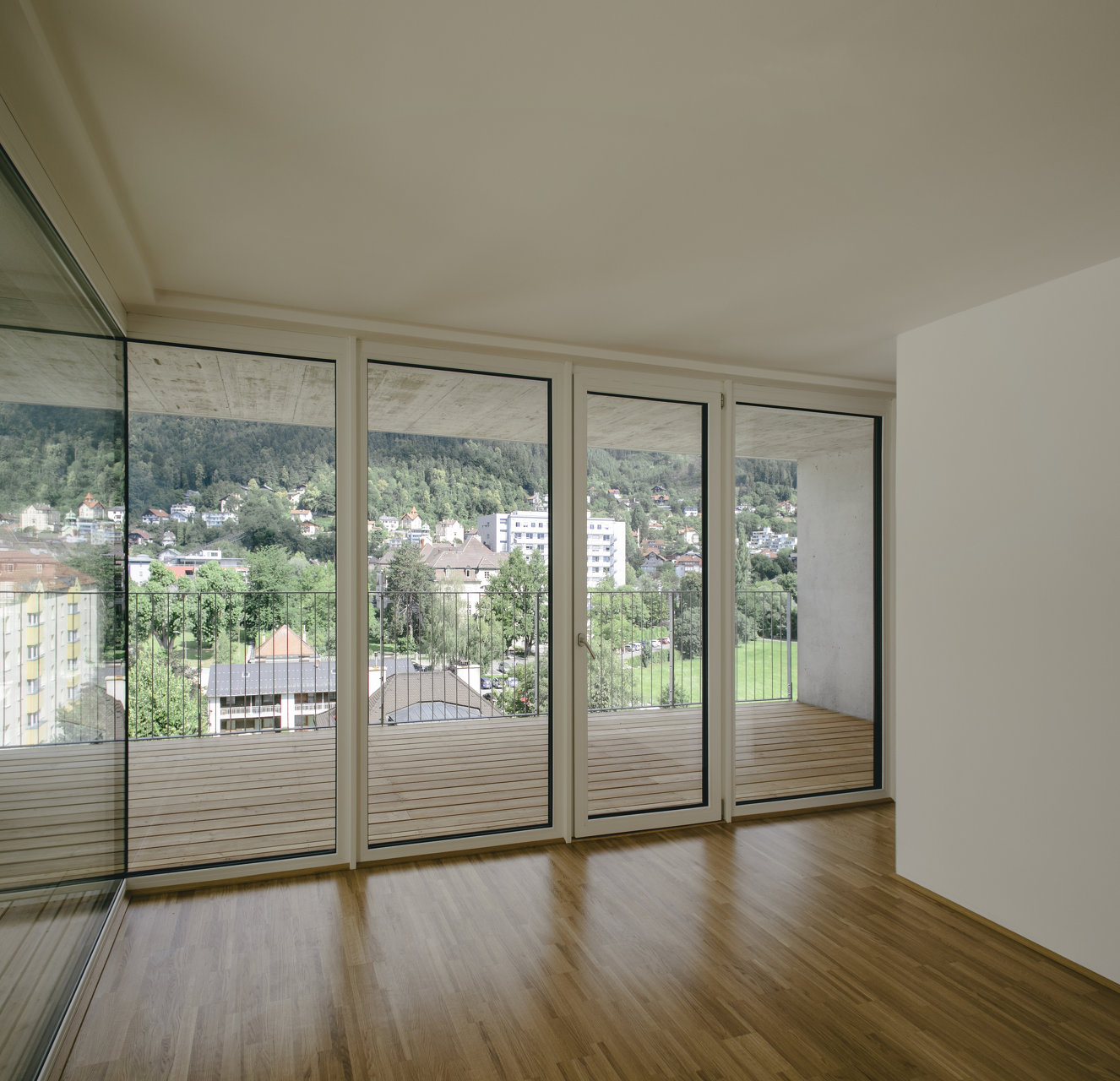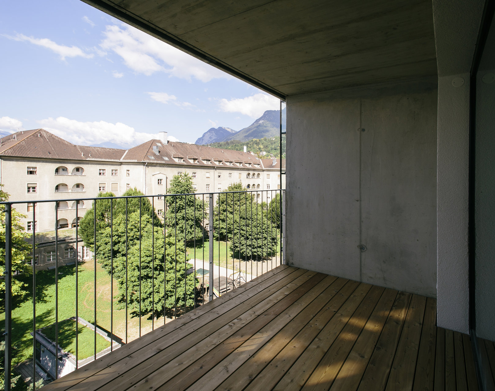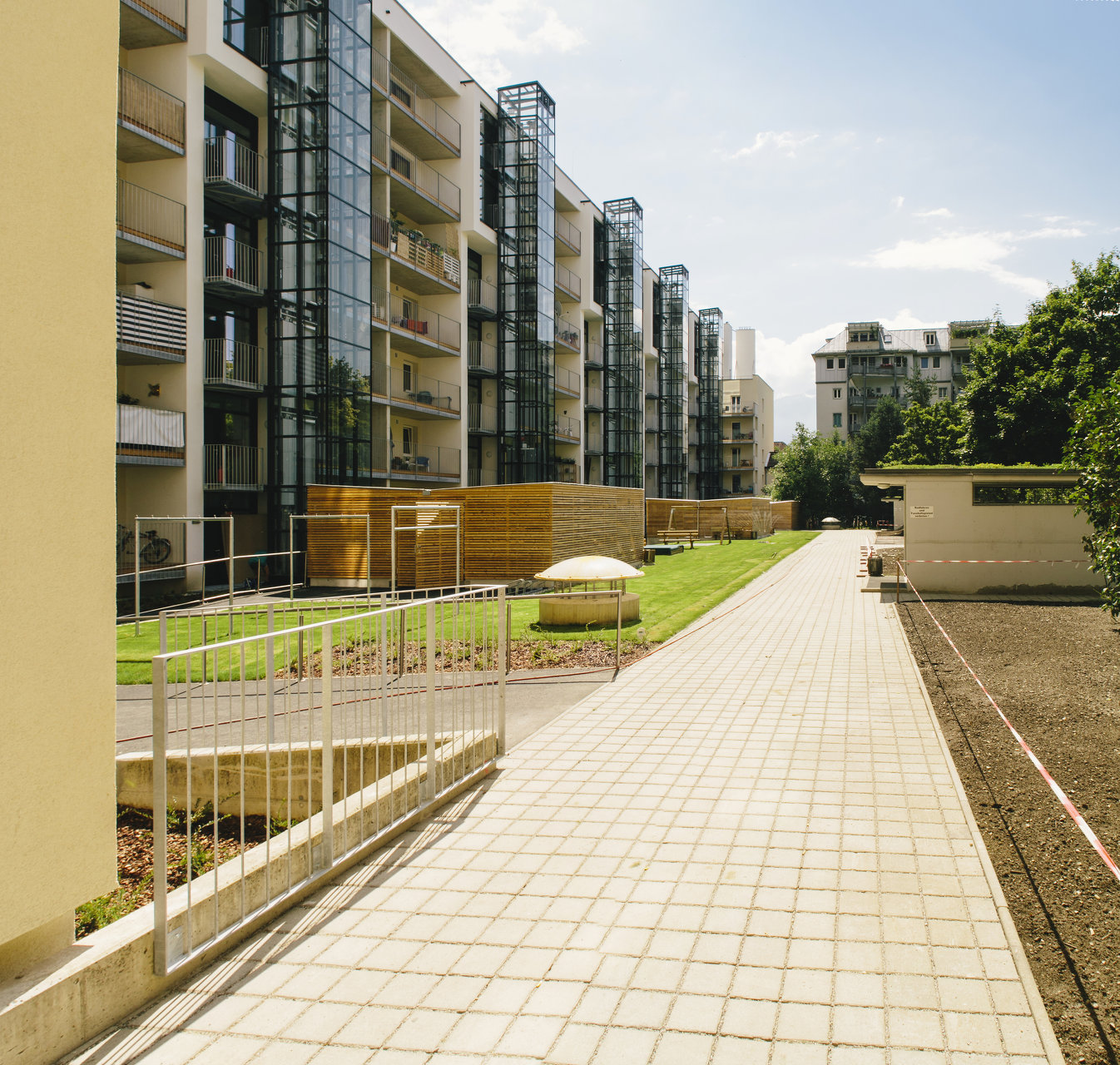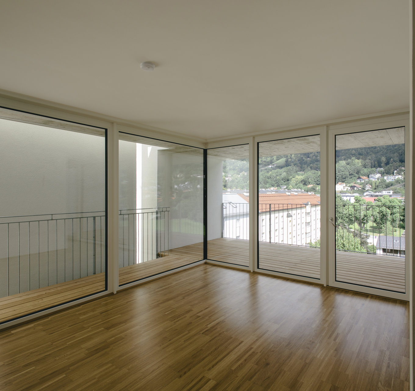 Eine Wohnanlage aus den 1950er Jahren mit 92 Wohnungen wurde umfassend saniert und gleichzeitig mit einer zweigeschoßigen Aufstockung um 32 Wohnungen erweitert. Neben der thermischen Sanierung erhielt ein Großteil der Wohnungen einen Liftanschluss und größere Balkone. Dämmmaßnahmen und der Einbau der dezentralen Be- und Entlüftung mit Wärmerückgewinnung wurden im bewohnten Zustand durchgeführt Die Aufstockung setzt sich durch ein straßenseitig umlaufendes Fensterband vom sanierten Bestand ab, gliedert sich in Ihrer Höhe aber ohne weiteres in die umgebende Bebauung ein. Sowohl die Sanierung des Bestands als auch die umfassende Aufstockung erfolgte nach den Qualitätsmaßstäben des Passivhaus-Instituts. (Text: Staatspreis Architektur & Nachhaltigkeit 2019)