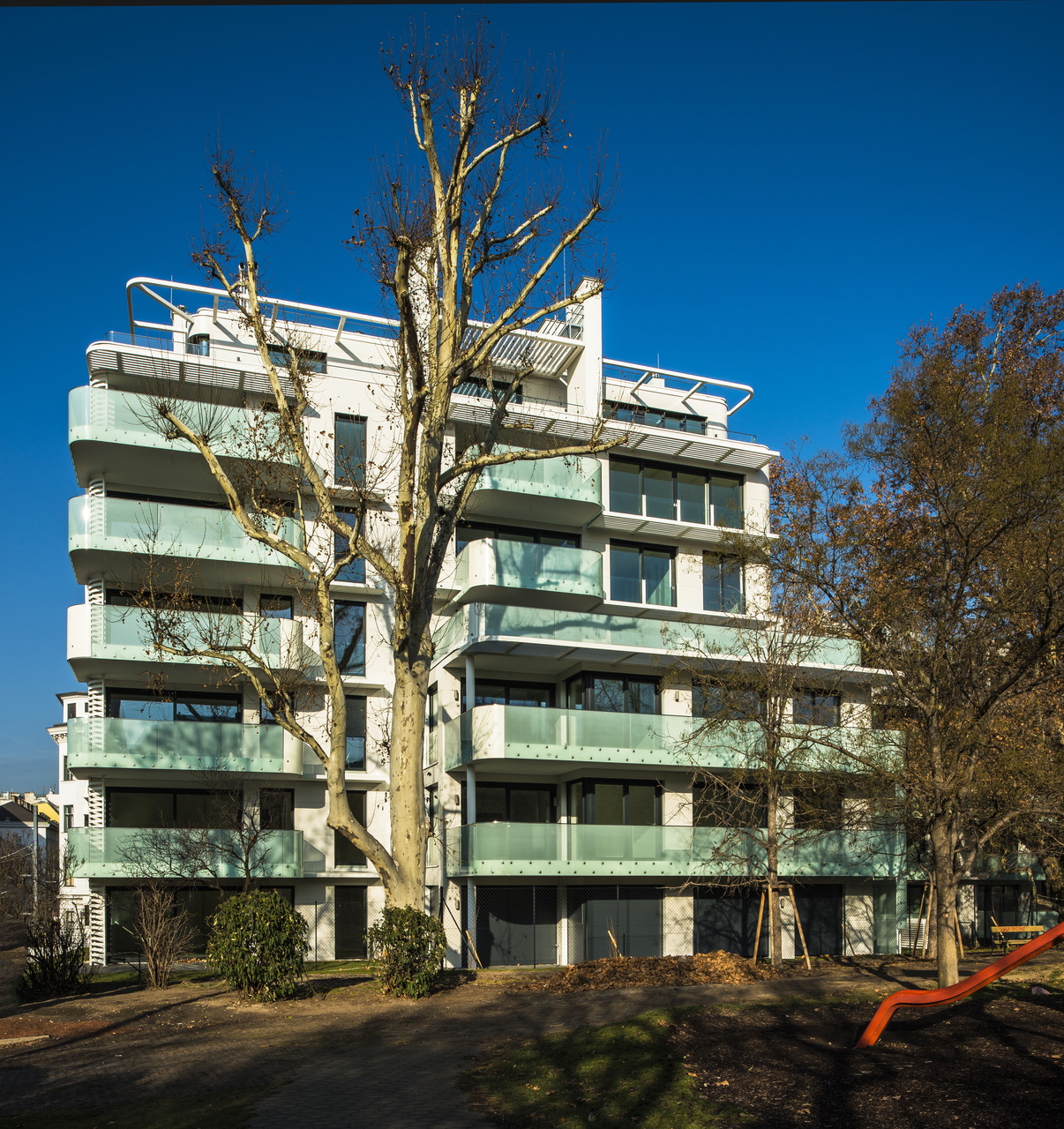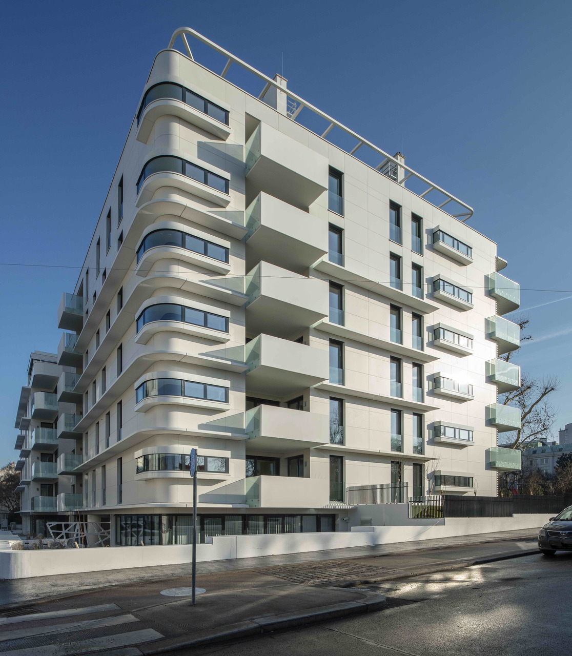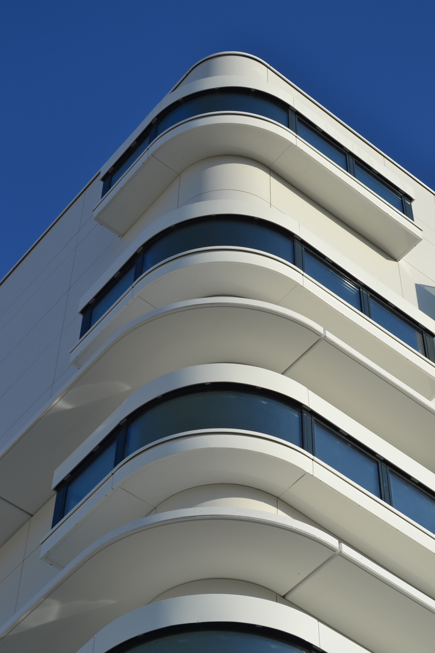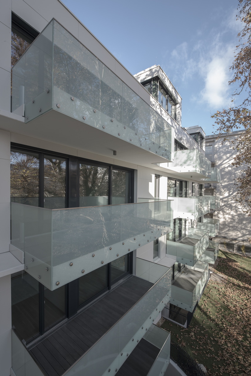 Die Fassade ist mit hell leuchtenden, glatten, großformatigen Faserzementplatten verkleidet. Über Eck schaffen Sonderelemente mit einem Radius von ca. 80 cm fließende Übergänge. Für die Nutzer bieten die glatten Oberflächen vor allem auf den zahlreichen Balkonen bzw. Terrassen eine direkt „erfühlbare“ haptische Qualität.
