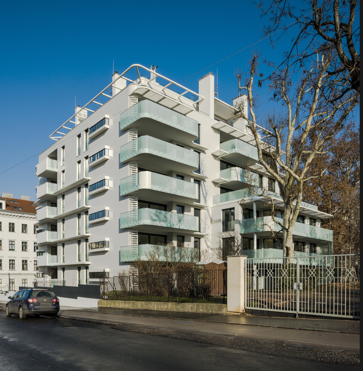Das Grundstück besteht aus zwei Bauplätzen mit zwei unterschiedlich gewidmeten Bauklassen (Bauklasse III und IV). Die beiden Baukörper wurden formal zwar individuell behandelt, in der Gesamtwirkung werden sie jedoch als ein Wohnhaus wahrgenommen. Viele Passanten verlangsamen ihr Tempo, wenn sie an dem Haus vorbeikommen, bleiben auch stehen und staunen angesichts des ungewöhnlichen Entwurfs, aber auch angesichts des ungewöhnlich hohen Ausführungsstandards, bzw. mit den Worten der Architekten: der „akribischen Detailplanung“.