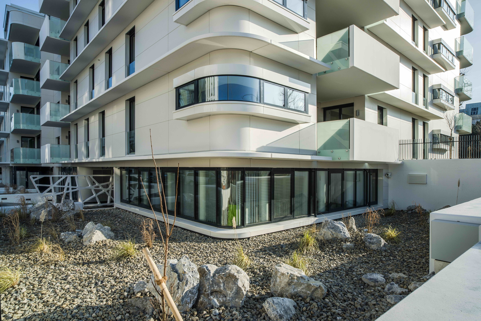 Dem Gebäude vorgelagert befinden sich die abgesenkten Vorgärten. Die Außenräume sind nur niederschwellig zum Straßenraum hin abgegrenzt: eine ca. kniehohe Mauer gibt den Blick auf die Vorgärten frei. Die minimalistische Gestaltung mit Gräsern, Sträuchern und Steinen hat einen pragmatischen Grund: ein begrünter Vorgarten ohne bauliche Abgrenzung ist ein ideales Hundeklo. Steiniges Terrain hingegen wird von Hunden gemieden.
