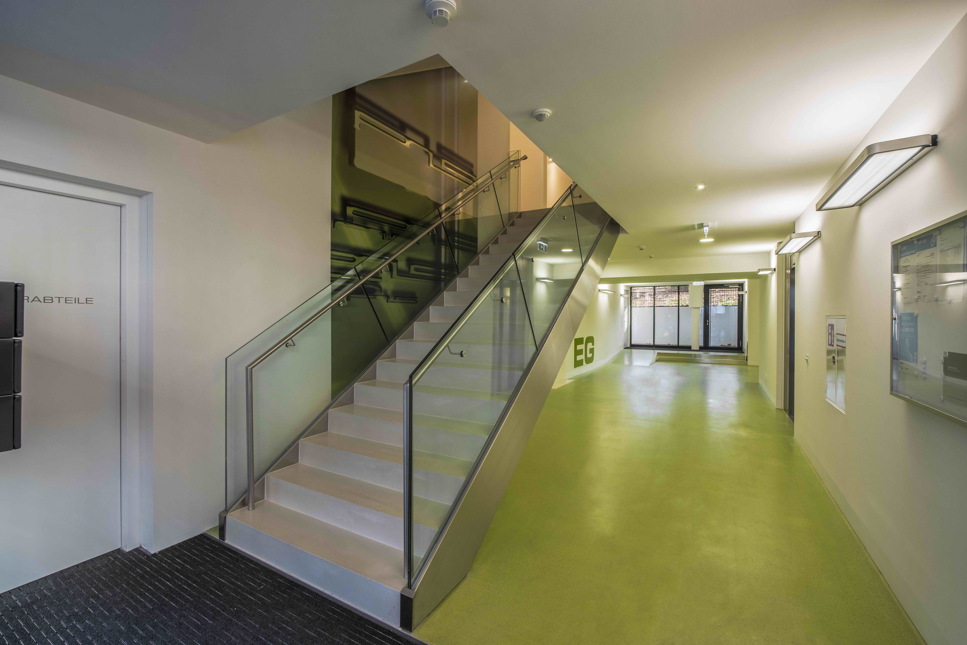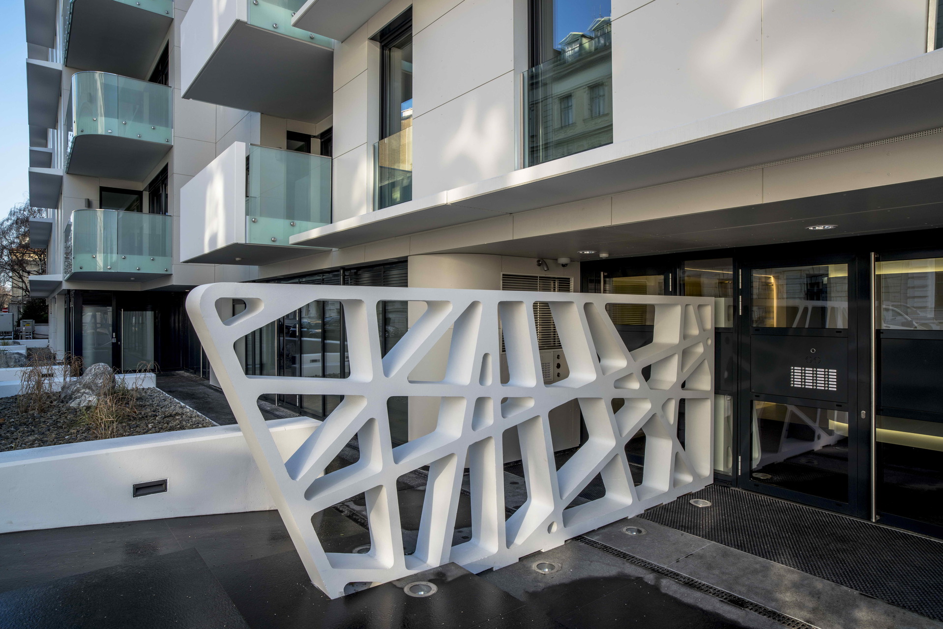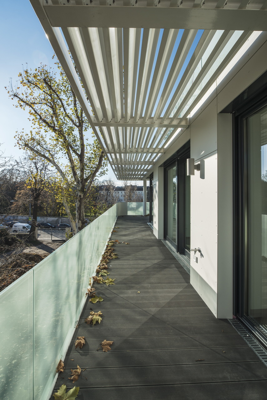 Ein paar Schritte weiter markiert eine Betonskulptur den Eingang zum Haus Nr. 17. Die optische Attraktion leitet zu Fuß ankommende Besucher, die meist aus der Argentinierstraße zu erwarten sind, zum etwas tiefer sitzenden Haupteingang. Das Foyer wird mit einer bedruckten und hinterleuchteten Glaswand aufgewertet. Die Stiegenhäuser laden die Bewohner dazu ein, auf den Lift zu verzichten. Für das Treppenhaus des Hauses Nr. 15 wurde über die gesamte Höhe vom EG bis ins 5. OG eine eigens angefertigte, fast 50 m² große Druckgrafik verwirklicht. (Martina Frühwirth, nach einem Text der Architekten)