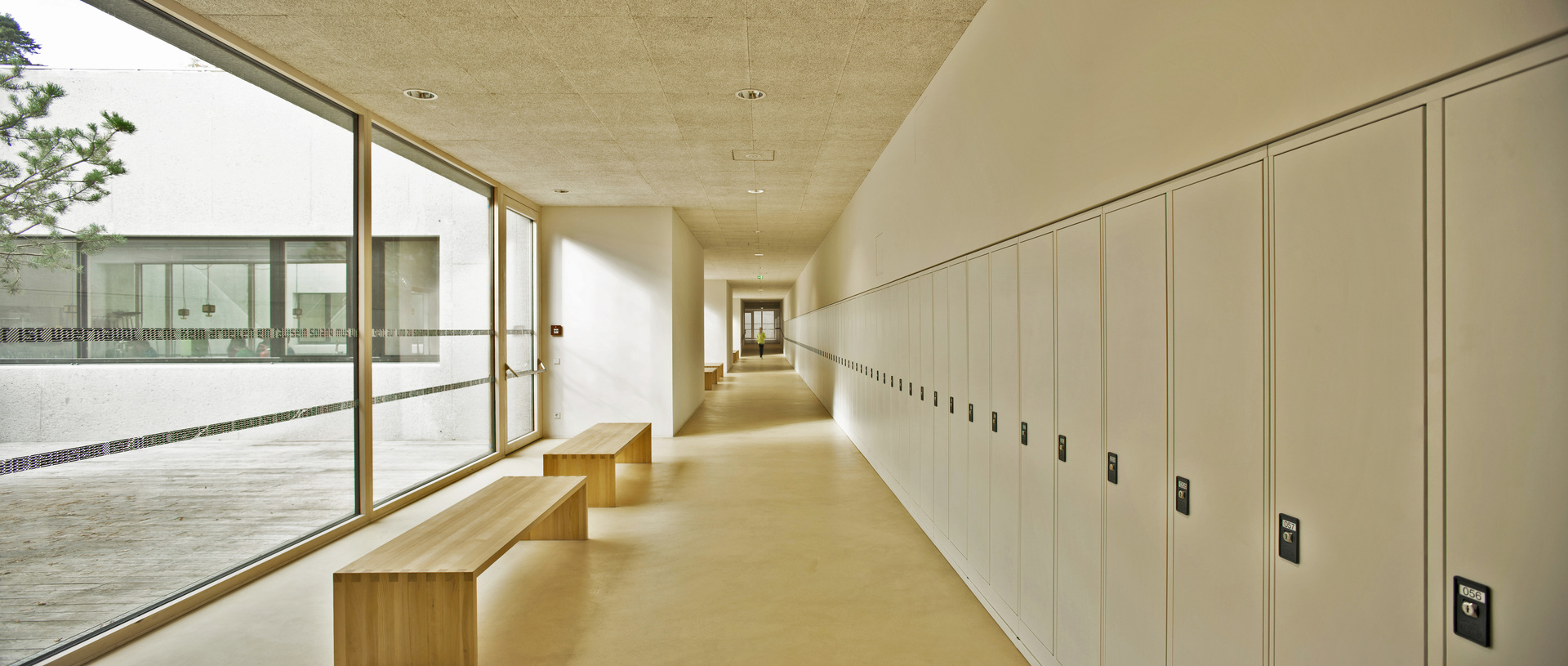 In den Erschließungszonen kommen hellbeige Holzwolleplatten (Heratekta) als Akustikelemente zum Einsatz. In den Klassen hängen weiche, weiß gemalte, Streifenelemente vertikal, abwechselnd mit den Lampen, von der Decke. Damit wird die vorgeschriebene Raumhöhe (3,20 m) und die Speicherfähigkeit des Betons genutzt. Am Boden kommt im Gang Lehm-Kaseinspachtelung in gelb-oka Pigmentierung vor, das Linoleum in den Klassen im gleichen Farbton, mit Anthrazit-Sprenkel. Hell sind auch die Spindreihen vor den Klassen und im Erdgeschoss die Vitrinen, aus Weißtanne, wie die Türelemente. Ansonsten alles neutral und weiß: Die Beton-Innenwände weiß gespachtelt, die Schränke in den Klassen.