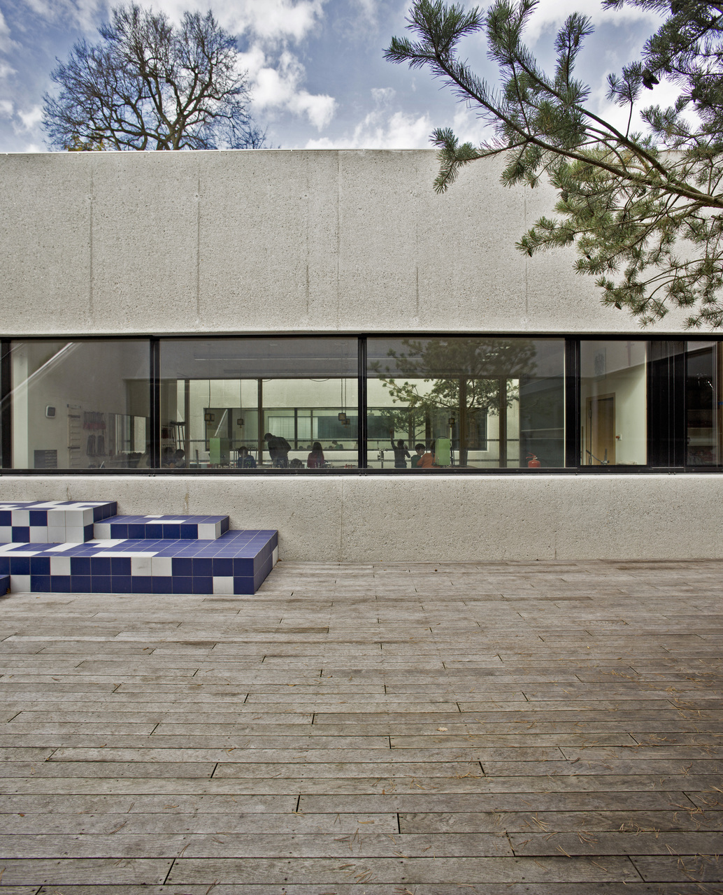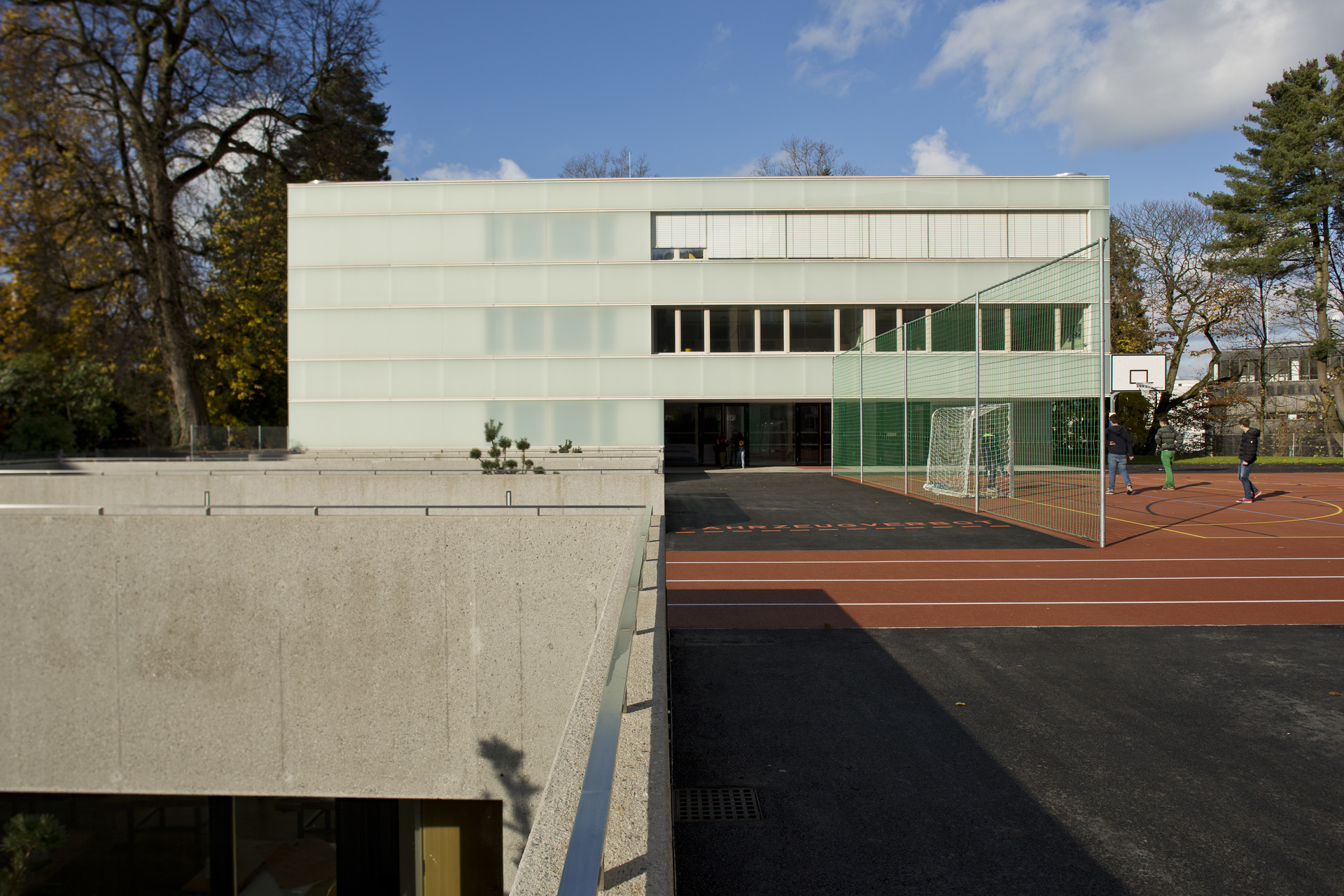 In den Klassengeschoßen gruppieren sich je vier Klassen eines Jahrgangs um eine Art „Marktplatz“, dem je ein Lichthof zugeordnet ist. Einer der beiden sticht bis ins Untergeschoß, um auch die EDV- und naturwissenschaftlichen Räume unten lichthell zu erschließen. Diese halböffentlichen Zonen können als Pausenflächen genutzt werden oder für neue pädagogische Unterrichtsvarianten, klassenübergreifende Gruppen und Diskussionsrunden.
