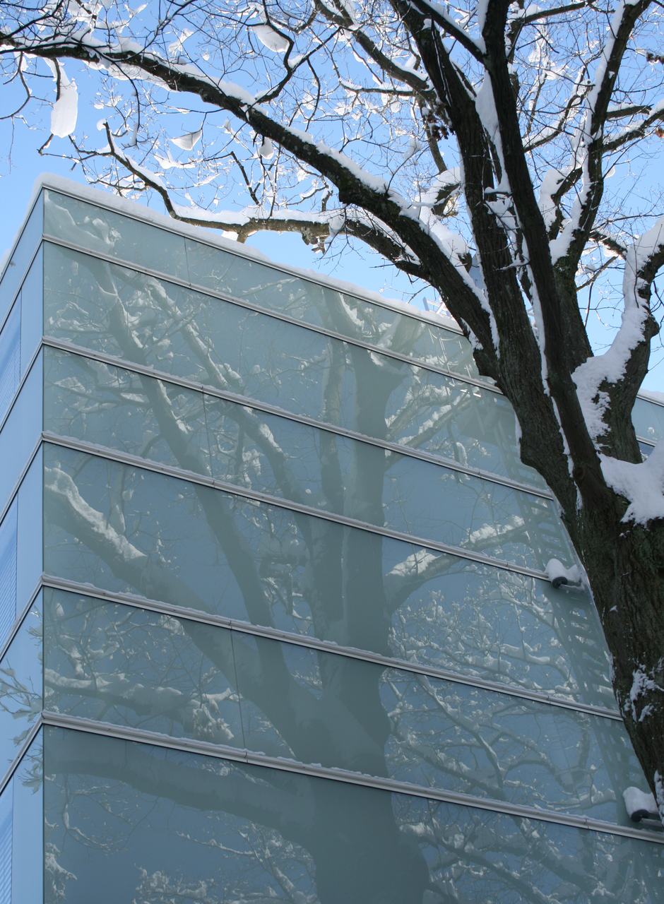 Die Fenster sind nur für Reinigungszwecke öffenbar. Eine vollständige Glashaut, Klarglas oder satiniert, mit durchgezogenen Linien der Strangpressprofile aus Aluminium spiegelt den Naturraum, die Bäume wider, das Gebäude scheint sich aufzulösen. Konstruktiv handelt es sich um eine vorgehängte Glasfassade, die Hinterlüftung war ein eigenes und anspruchsvolles Kapitel der Fassadenplaner.