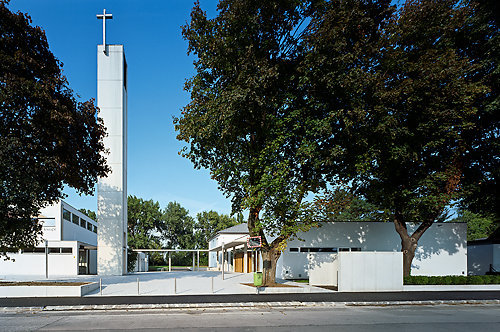 Die abschirmende Mauer ist gefallen, den Niveausprung zum Gehsteig bewältigen im Vorfeld der Kirche mit Betonmauern umsäumte Beete, aus denen die alten Bäume emporwachsen. Das Platzzentrum ist barrierefrei zugänglich. Ein paar Poller sind offenbar notwendig, um das unbefugte Befahren zu verunmöglichen. Das gestalterisch wichtigste Element ist ein als minimalistissche, weiß verputzte Stahlbetonkonstruktions ausgeführter Umgang, der dem Platz Halt und Fassung am Übergang zur dahinterliegenden Gartenfläche gibt und eine gedeckte Verbindung zwischen Kirche und Pfarrsaal herstellt. Fahrradständer wurden dahinter angeordnet und unterbrechen damit auch nicht die Kontinuität der ebenen Fläche. Beleuchtet wird mittels schlichter Stelen, die weder physisch noch optisch viel Raum einnehmen. Aus einem klein karierten Vorhof wurde ein öffentlicher Platz, der zwar nicht groß ist, aber viel Spielraum lässt.