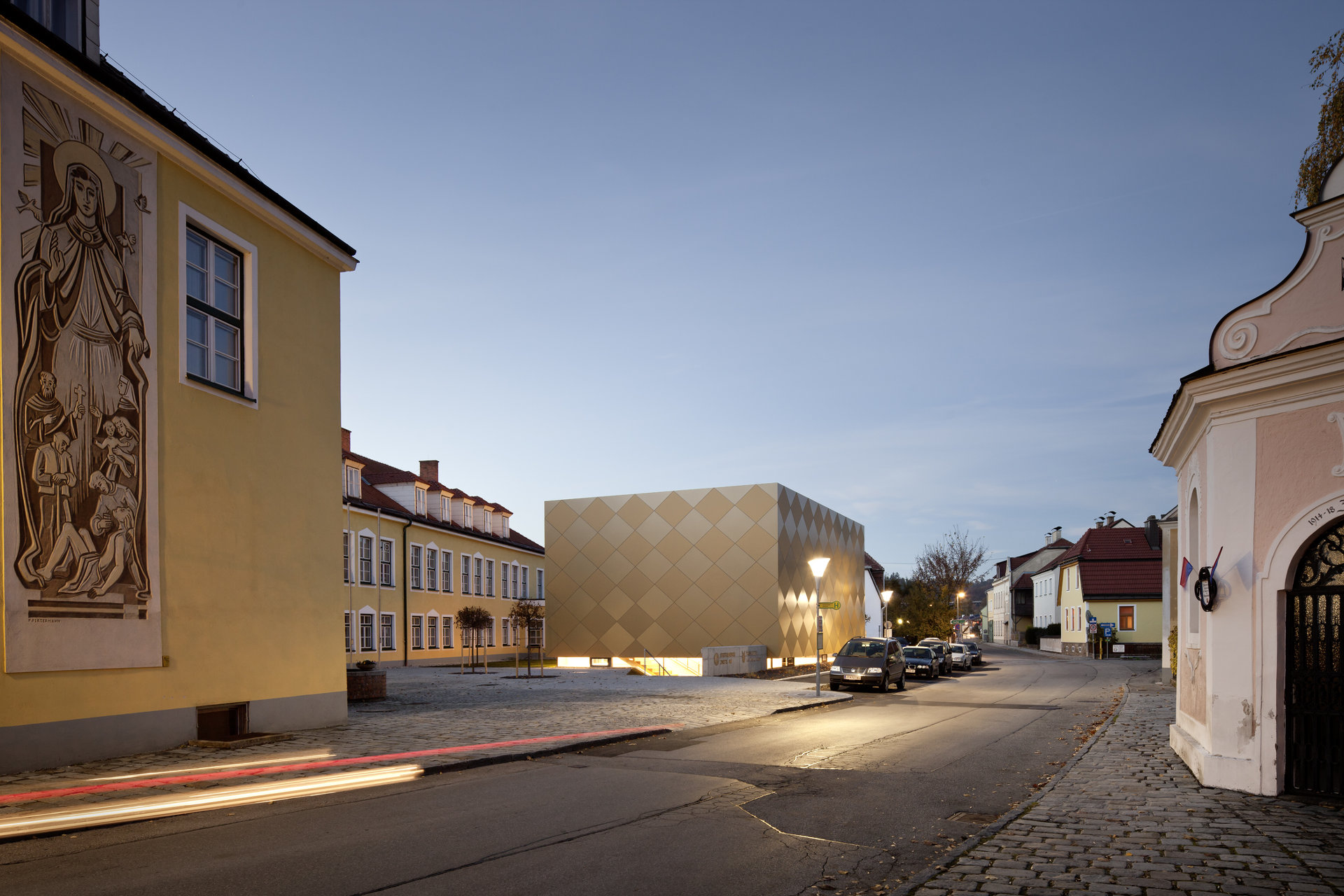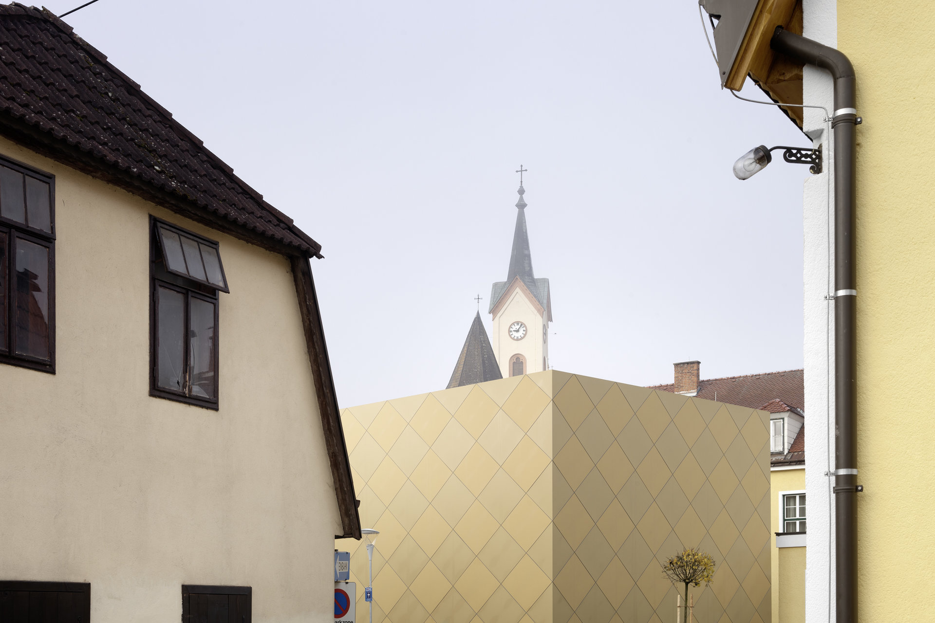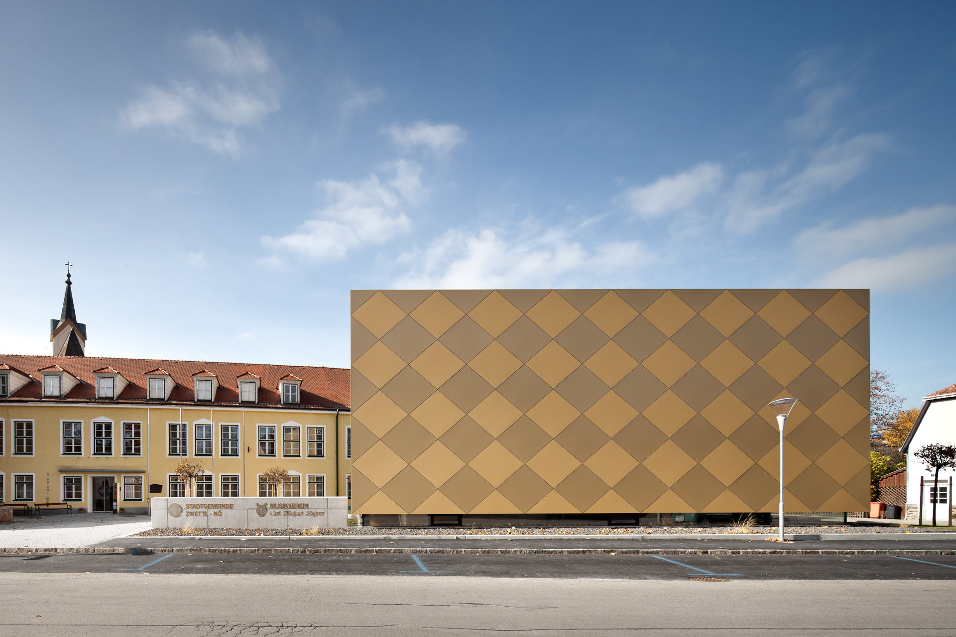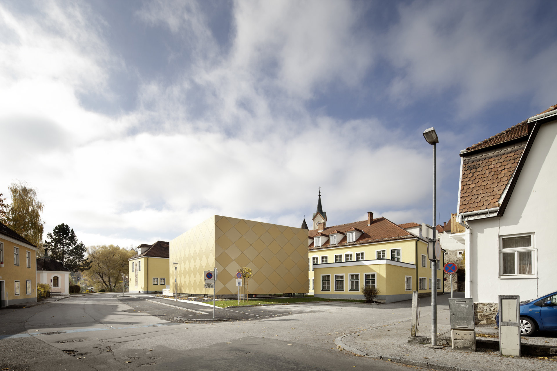 Durch die Auslagerung des Musikvereins wird im Bestandsgebäude Platz geschaffen. Die Positionierung des neuen Gebäudes fasst den bisher nicht definierten Platz und bewirkt eine Aufwertung der Eingangssituation in das Stadtamt. Um die akustischen Anforderungen der Musiker:innen und die maximalen Förderkriterien des Landes Niederösterreich zu erfüllen, muss der Probenraum eine lichte Raumhöhe von fünf Meter und eine Fläche von Quadratmeter pro MusikerIn aufweisen. Diese Parameter definierten das Volumen des neuen Baukörpers.