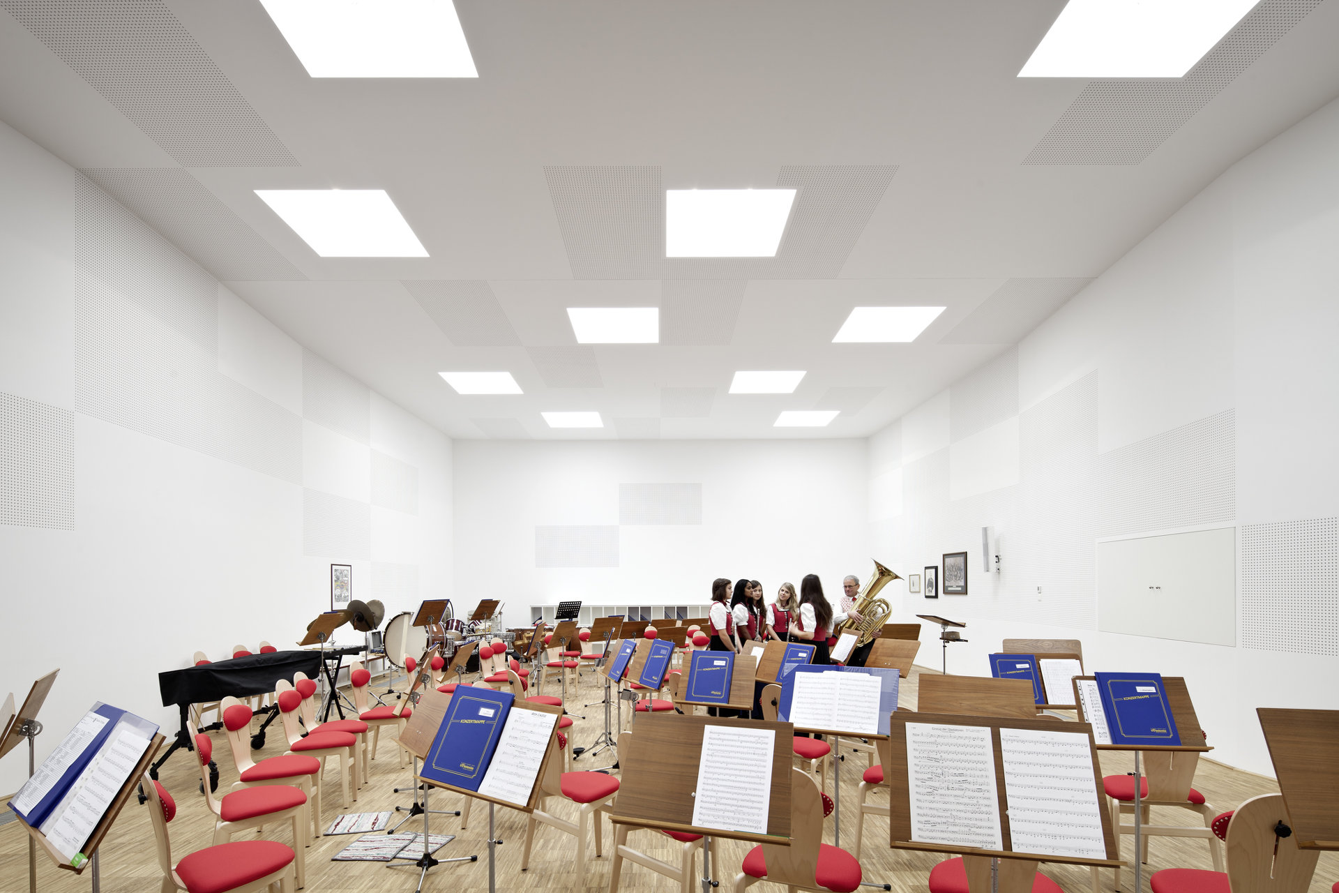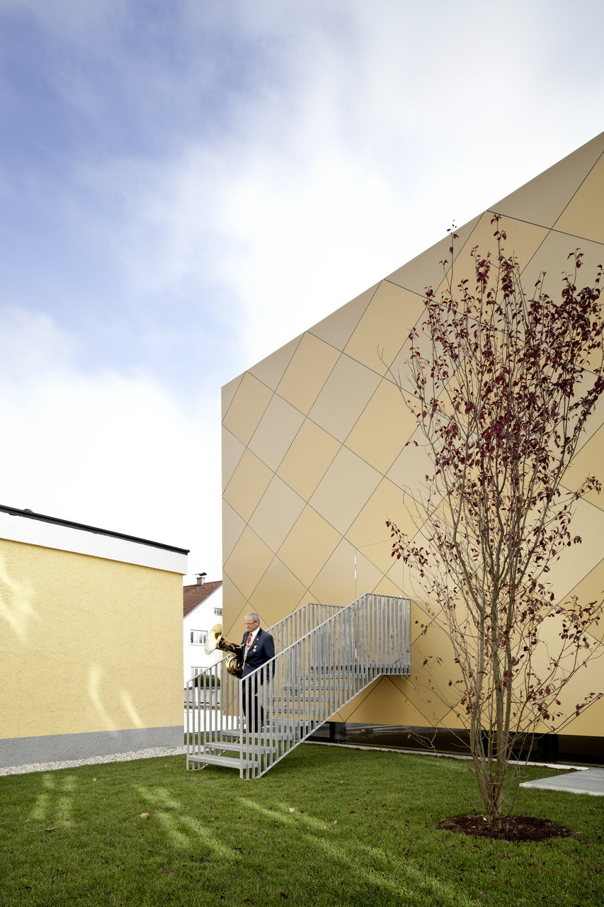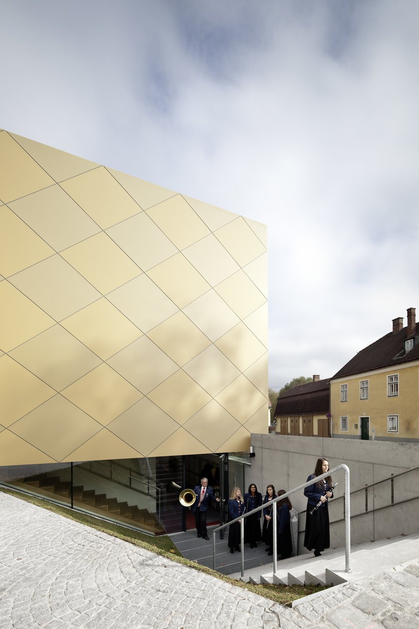 Vom Vorplatz führt eine Treppe zum Eingangsbereich. Die Einrichtung des Aufenthaltsraumes wurde von den Mitgliedern des Musikvereines in Eigenleistung bewerkstelligt, wodurch die Identifikation mit ihrem Gebäude gestärkt und Kosten gespart werden konnten. Das Obergeschoss ist ausschließlich dem Probenraum vorbehalten. Die gleichmäßige natürliche Belichtung erfolgt von oben über Lichtkuppeln. Die raumakustischen Maßnahmen sollten den Raum nicht dominieren und wurden in einem Spiel aus gelochten und glatten weißen Wandverkleidungen ausgeführt. Umso signifikanter tritt der Probenraum nach außen in Erscheinung: In seiner zeitgemäßen, reduzierten kubischen Formensprache bildet der Neubau einen bewussten Kontrapunkt zum benachbarten Stadtamt. Die Fassadengestaltung in Form von goldfarbenen, karoförmigen Aluminiumverbundplatten wurde von den Blechblasinstrumenten und dem Muster der Trachten des Musikvereines abgeleitet. (Text: Architekten, red. bearbeitet)