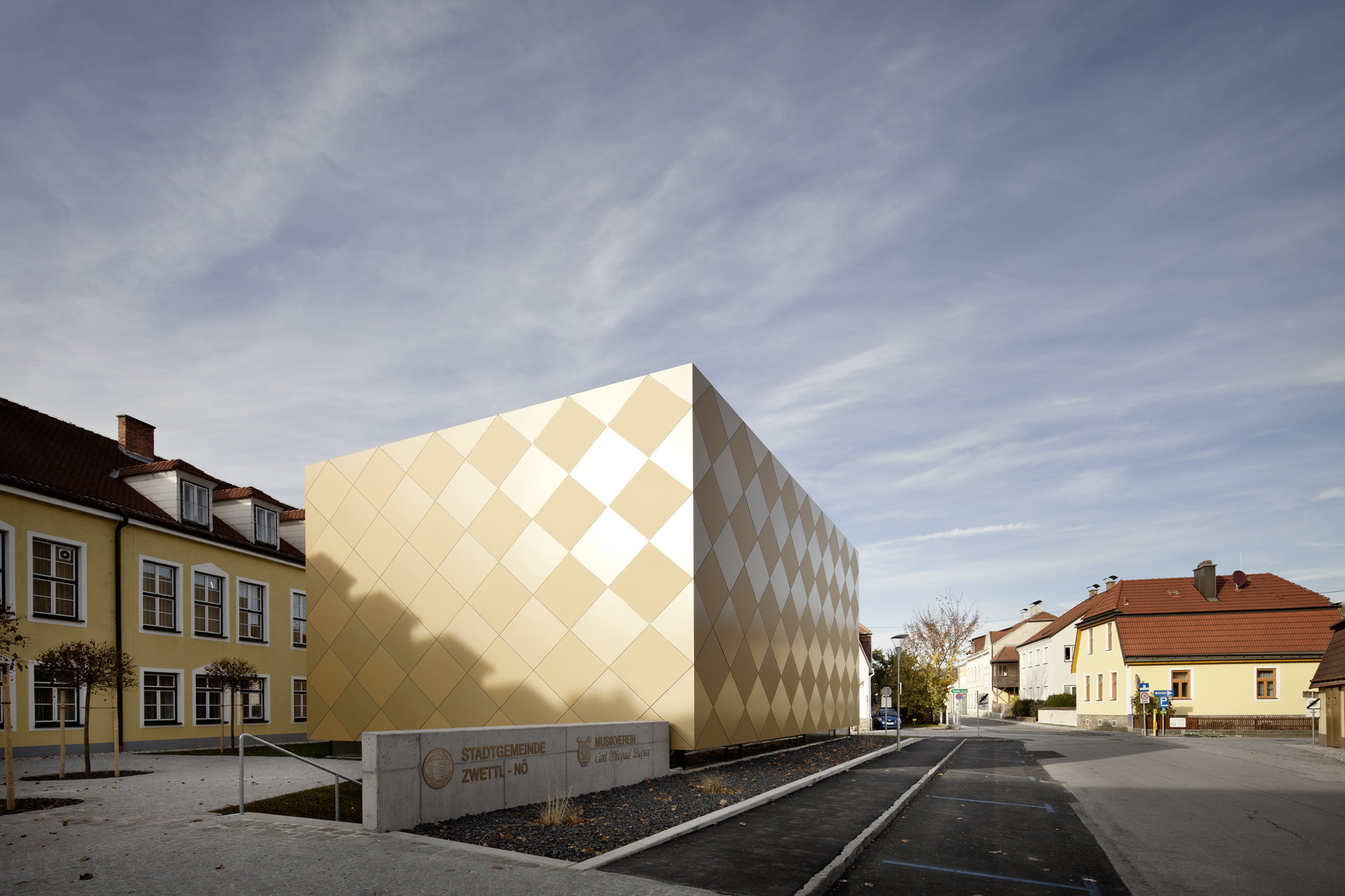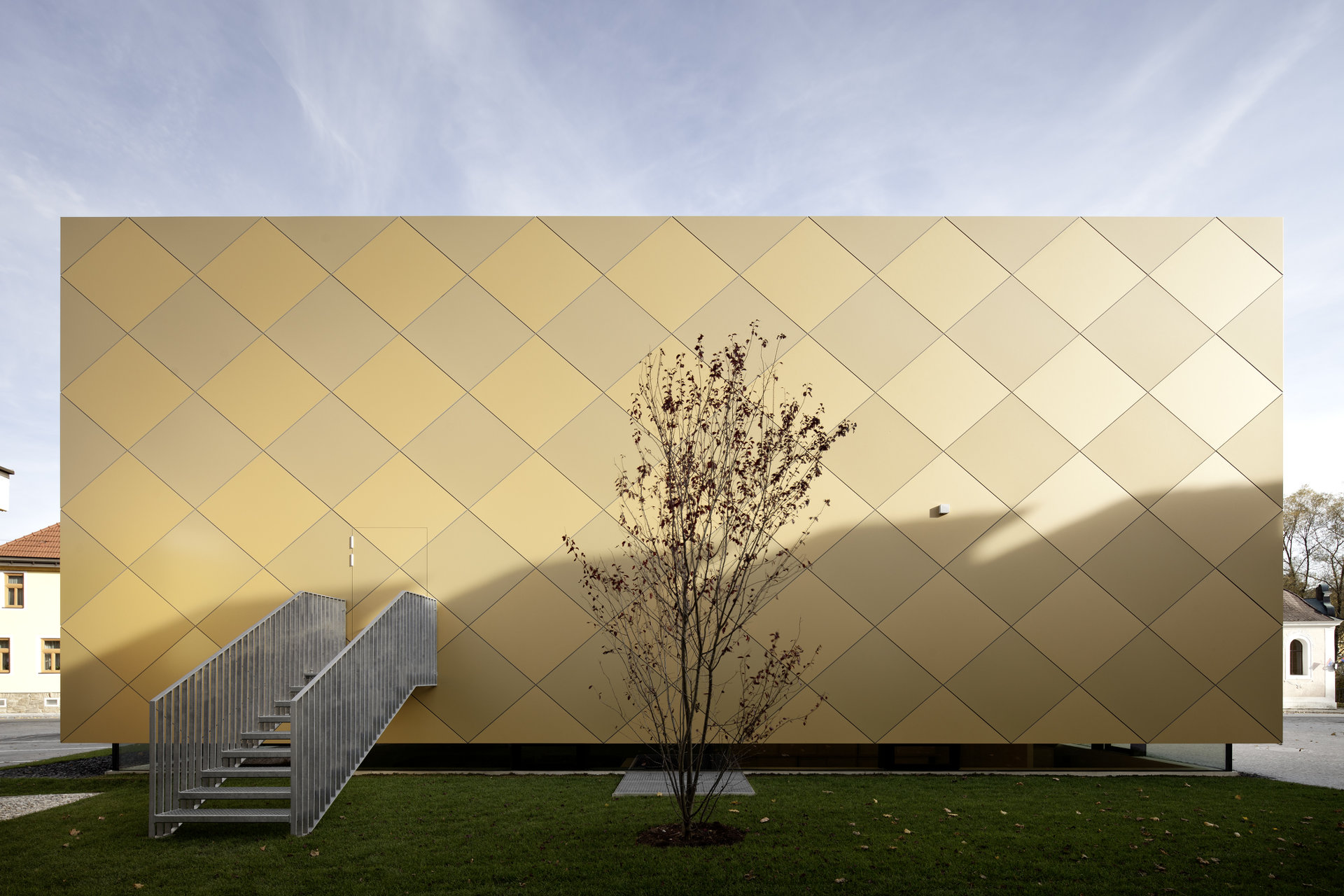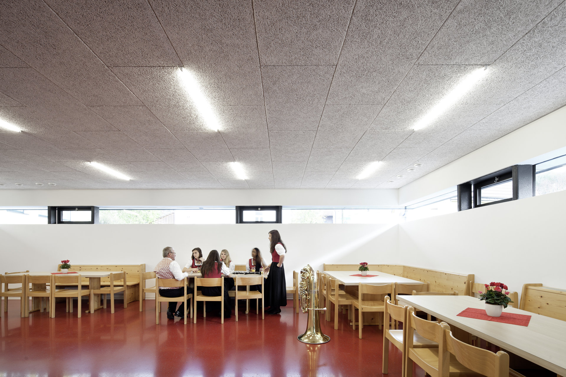 Vom Vorplatz führt eine Treppe zum Eingangsbereich. Die Einrichtung des Aufenthaltsraumes wurde von den Mitgliedern des Musikvereines in Eigenleistung bewerkstelligt, wodurch die Identifikation mit ihrem Gebäude gestärkt und Kosten gespart werden konnten. Das Obergeschoss ist ausschließlich dem Probenraum vorbehalten. Die gleichmäßige natürliche Belichtung erfolgt von oben über Lichtkuppeln. Die raumakustischen Maßnahmen sollten den Raum nicht dominieren und wurden in einem Spiel aus gelochten und glatten weißen Wandverkleidungen ausgeführt. Umso signifikanter tritt der Probenraum nach außen in Erscheinung: In seiner zeitgemäßen, reduzierten kubischen Formensprache bildet der Neubau einen bewussten Kontrapunkt zum benachbarten Stadtamt. Die Fassadengestaltung in Form von goldfarbenen, karoförmigen Aluminiumverbundplatten wurde von den Blechblasinstrumenten und dem Muster der Trachten des Musikvereines abgeleitet. (Text: Architekten, red. bearbeitet)