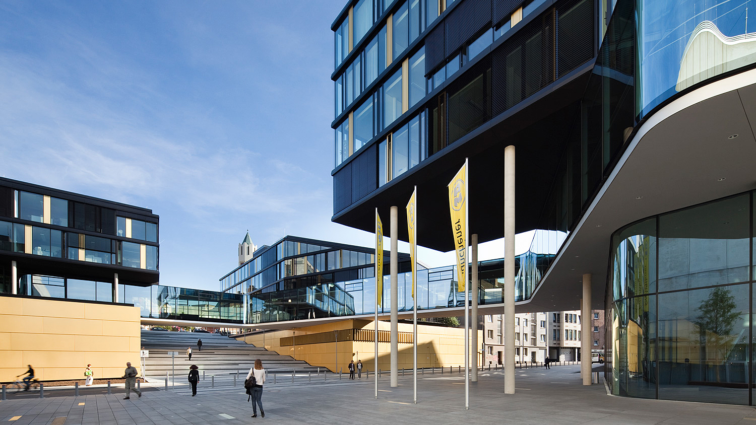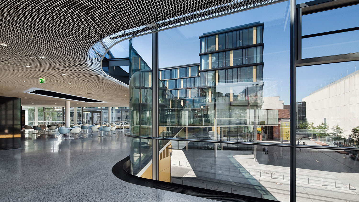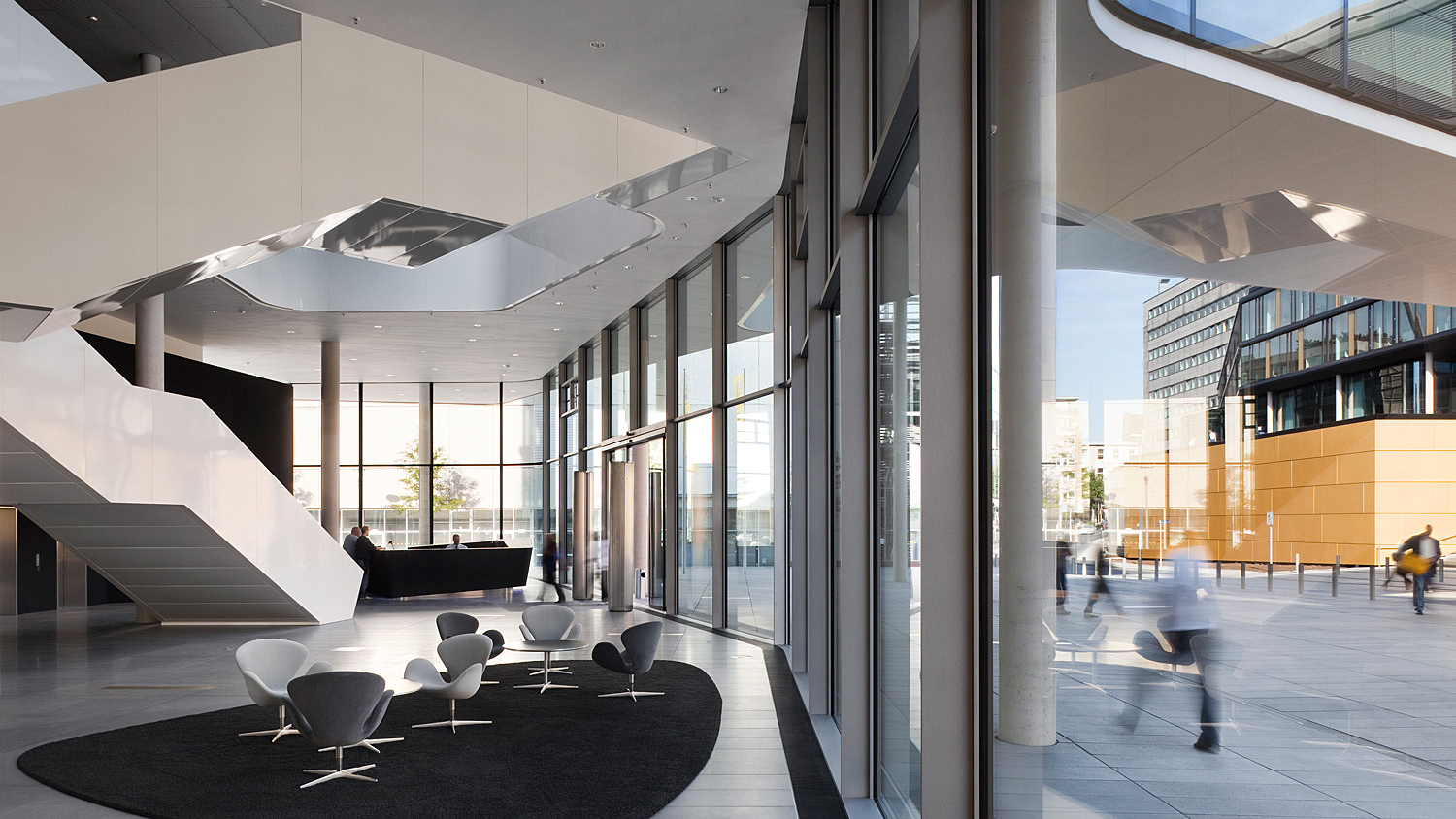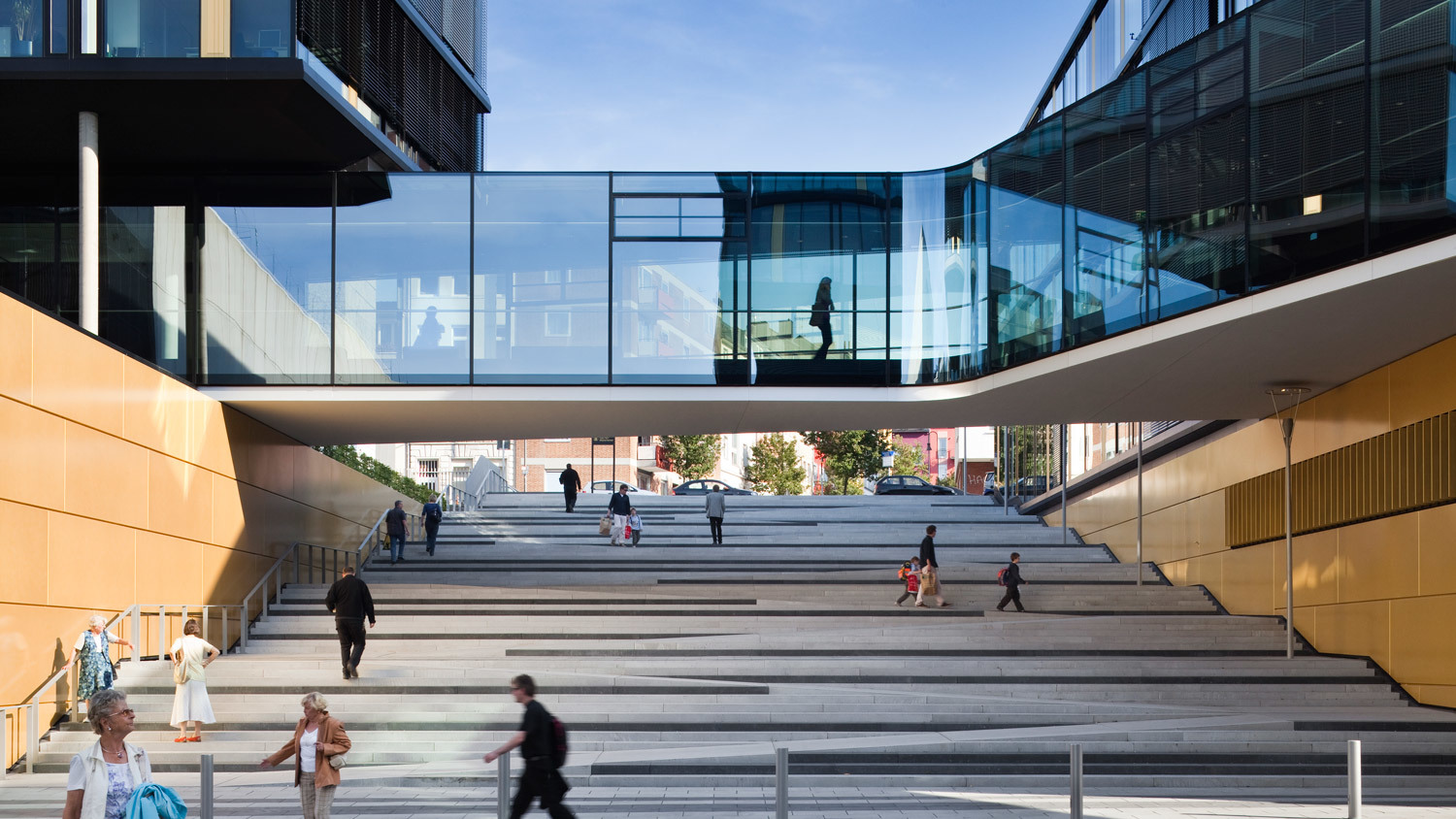 Der Erweiterungsbau besetzt zwei Blöcke der gründerzeitlichen Stadtstruktur und interpretiert deren typische Blockrandbebauung mit den halböffentlichen, durchgrünten Innenhöfen neu. Die gesamtstädtische Abfolge von Aufweitungen und Plätzen wird um die großzügige Freitreppe und den sich daraus entwickelnden Platz erweitert. Bestandsgebäude und Neubauten werden mit dem zentralen Element des inneren Boulevards zu einem Haus verbunden. Der Boulevard ist eine transparente Ebene, auf der Konferenzbereiche, Kantine, Cafeteria, Sitzungszimmer und Kommunikationszonen angeordnet sind. Einem Straßenraum gleich weitet er sich zu kleinen Plätzen mit differenzierten Qualitäten auf: Er schwebt durch die vielfältig gestalteten Gärten im Blockinneren und öffnet sich am Haupteingang und am neuen Pocketpark repräsentativ zum Straßenraum. [Text: Architekten)
