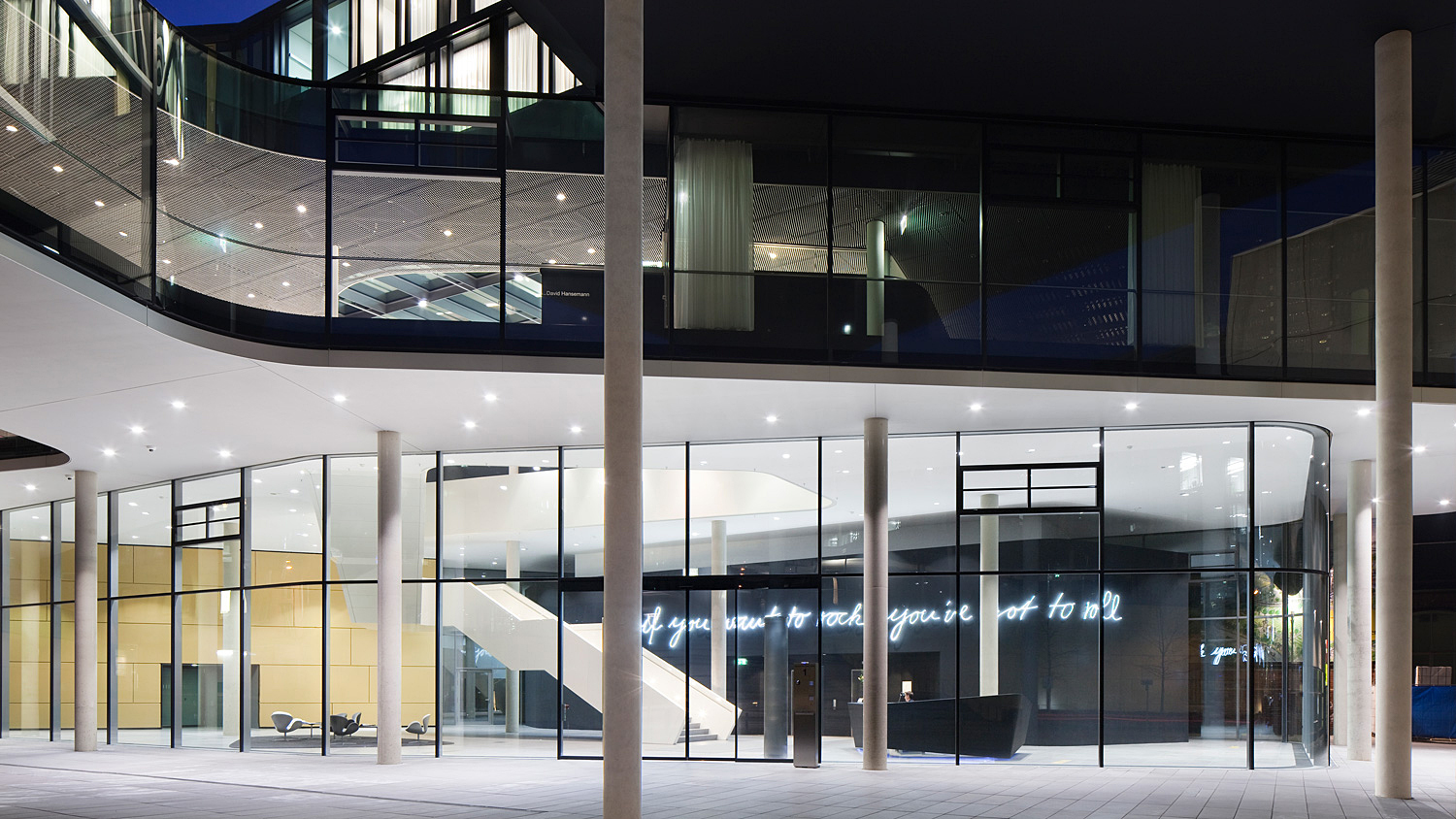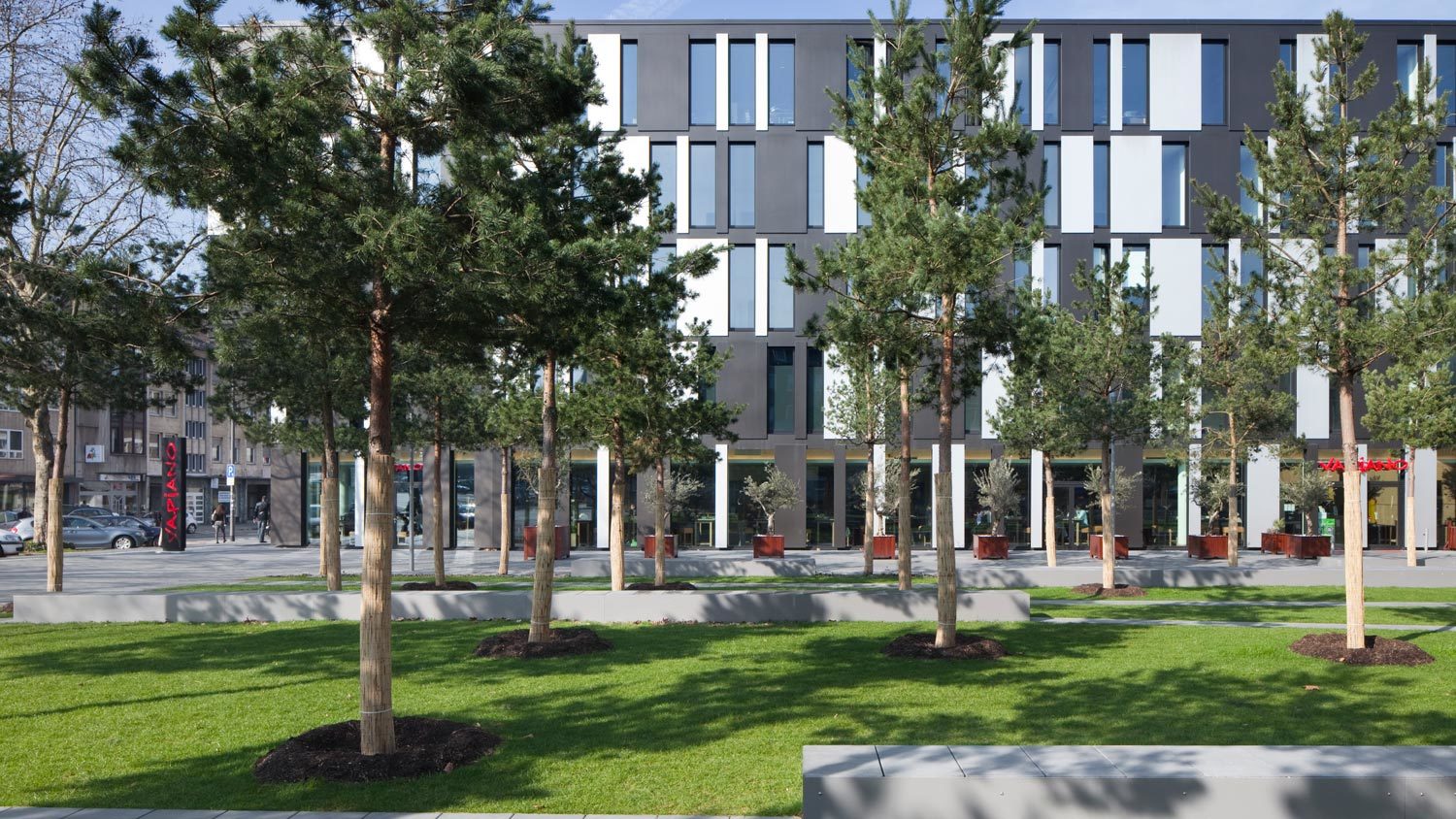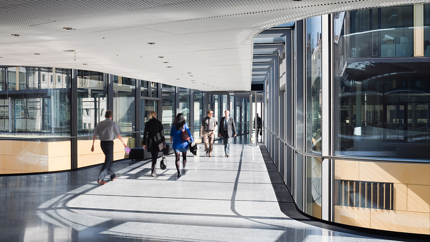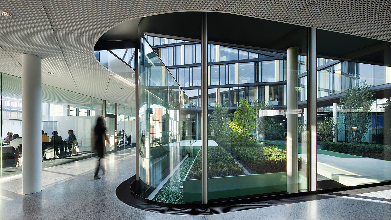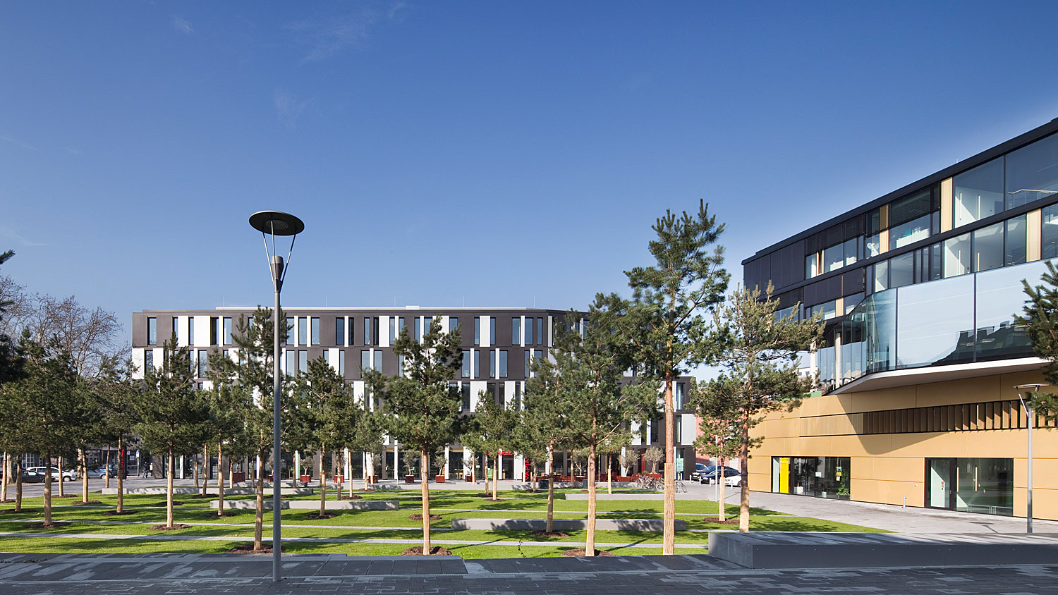 Der Erweiterungsbau besetzt zwei Blöcke der gründerzeitlichen Stadtstruktur und interpretiert deren typische Blockrandbebauung mit den halböffentlichen, durchgrünten Innenhöfen neu. Die gesamtstädtische Abfolge von Aufweitungen und Plätzen wird um die großzügige Freitreppe und den sich daraus entwickelnden Platz erweitert. Bestandsgebäude und Neubauten werden mit dem zentralen Element des inneren Boulevards zu einem Haus verbunden. Der Boulevard ist eine transparente Ebene, auf der Konferenzbereiche, Kantine, Cafeteria, Sitzungszimmer und Kommunikationszonen angeordnet sind. Einem Straßenraum gleich weitet er sich zu kleinen Plätzen mit differenzierten Qualitäten auf: Er schwebt durch die vielfältig gestalteten Gärten im Blockinneren und öffnet sich am Haupteingang und am neuen Pocketpark repräsentativ zum Straßenraum. [Text: Architekten)