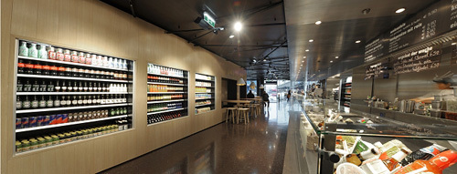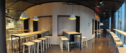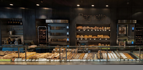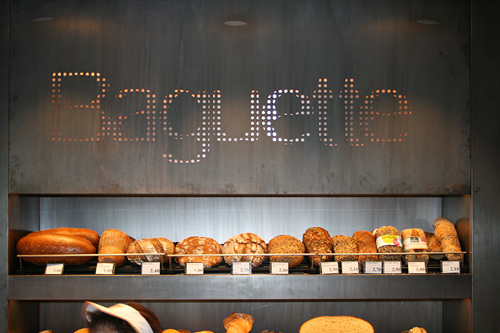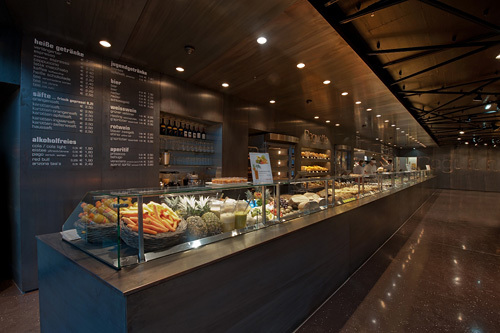 Das Baguette–Café liegt im Erdgeschoß des „Headline“, eines von henke und schreieck Architekten für die PEMA-Holding geplanten multifunktionalen Gebäudekomplexes unweit des Innsbrucker Hauptbahnhofs. Wesentliche Herausforderung im Entwurfsprozess war es, beruhigend auf den sehr stark von Schächten, Stützen und polygonalen Formen durchzogenen Innenraum zu reagieren und zugleich eine möglichst gute Anbindung an den Straßenraum an der stark frequentierten Kreuzung zu schaffen.Von dem an der Ecke gelegenen Eingang gliedert sich das Baguette in zwei Bereiche. Links vom Eingang befindet sich der Verkaufsbereich mit einer 20 m langen Theke und einem parallel dazu verlaufenden Rückverbau aus brüniertem Kupfer, in dem sämtliche Rohbauschächte und Vorsprünge aufgenommen werden. Auf der anderen Seite liegt der Café-Barbereich mit Sitzmöglichkeiten, hier kaschiert eine ausgerundete Rückwand aus Eiche mit integrierten Sitznischen die heterogene Grundform. Die Materialisierung in brüniertem Kupfer greift eine jahrhunderte alte Tradition auf, Kupfer im Lebensmittelbereich (z.B. Brauereien, Sennereien, Bäckereien) zu verwenden. (Text: Architekt; red. bearbeitet)