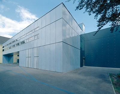 In der Materialität der Aussenhaut sind verschiedene Werkstoffe (mattblau satinierte Glasscheiben, dunkle Blechsandwichpaneele, milchigblaue Polycarbonatplatten, Blauprofilitglas) „artverwandt“ zur differenzierten Einheit gebunden. Das Fugenbild spannt sich wie ein Netz, das nach oben hin engmaschiger wird, über sämtliche Oberflächen. (Text: Gabriele Kaiser)