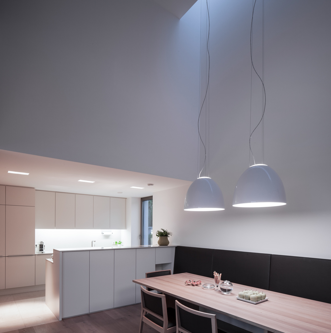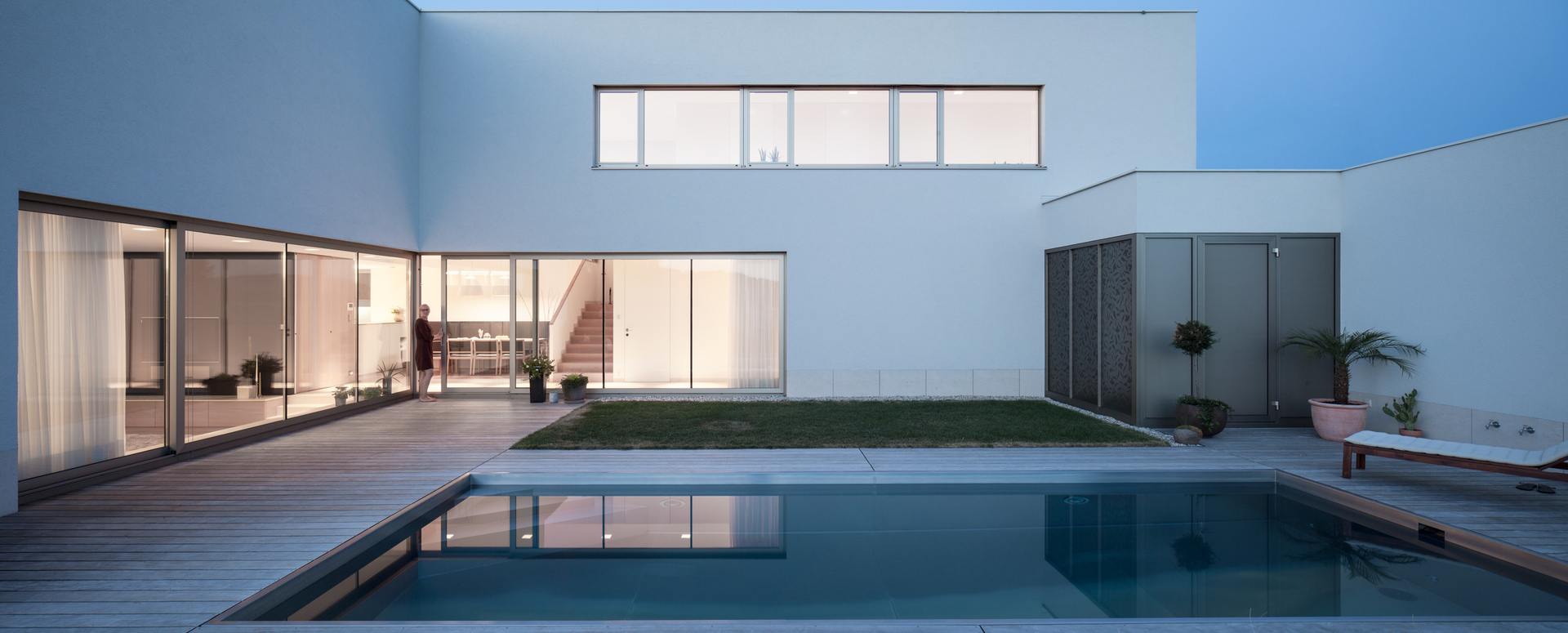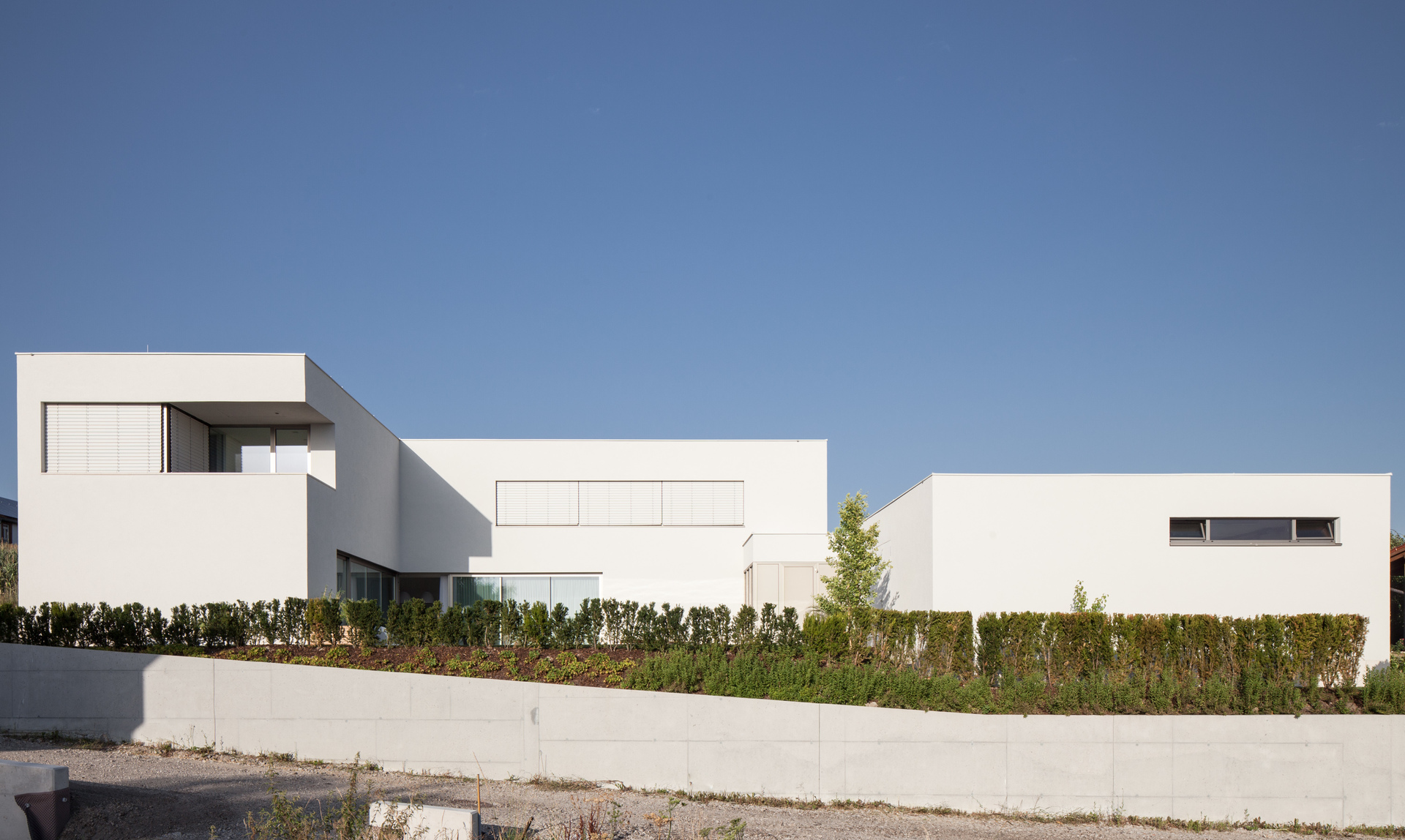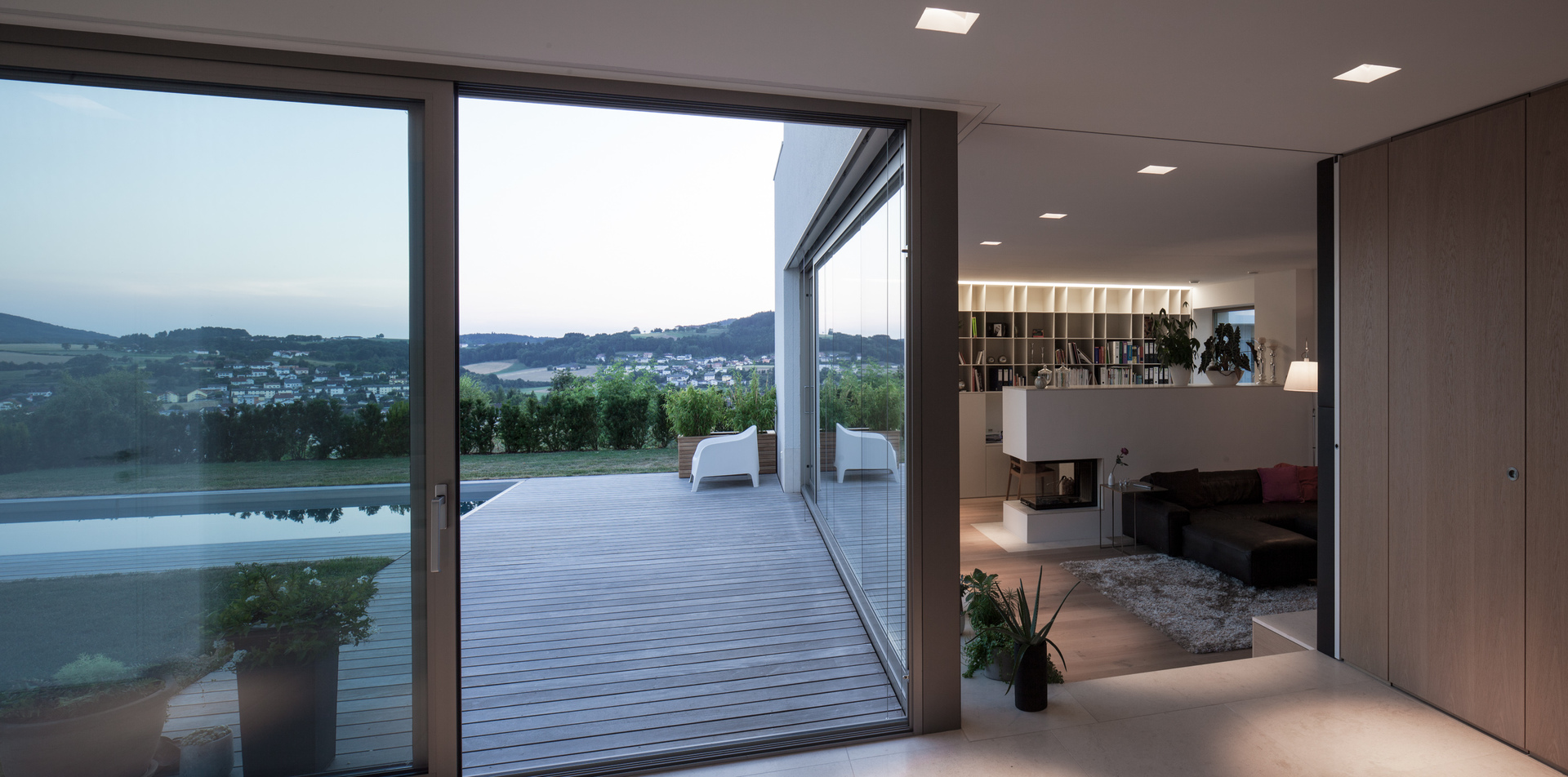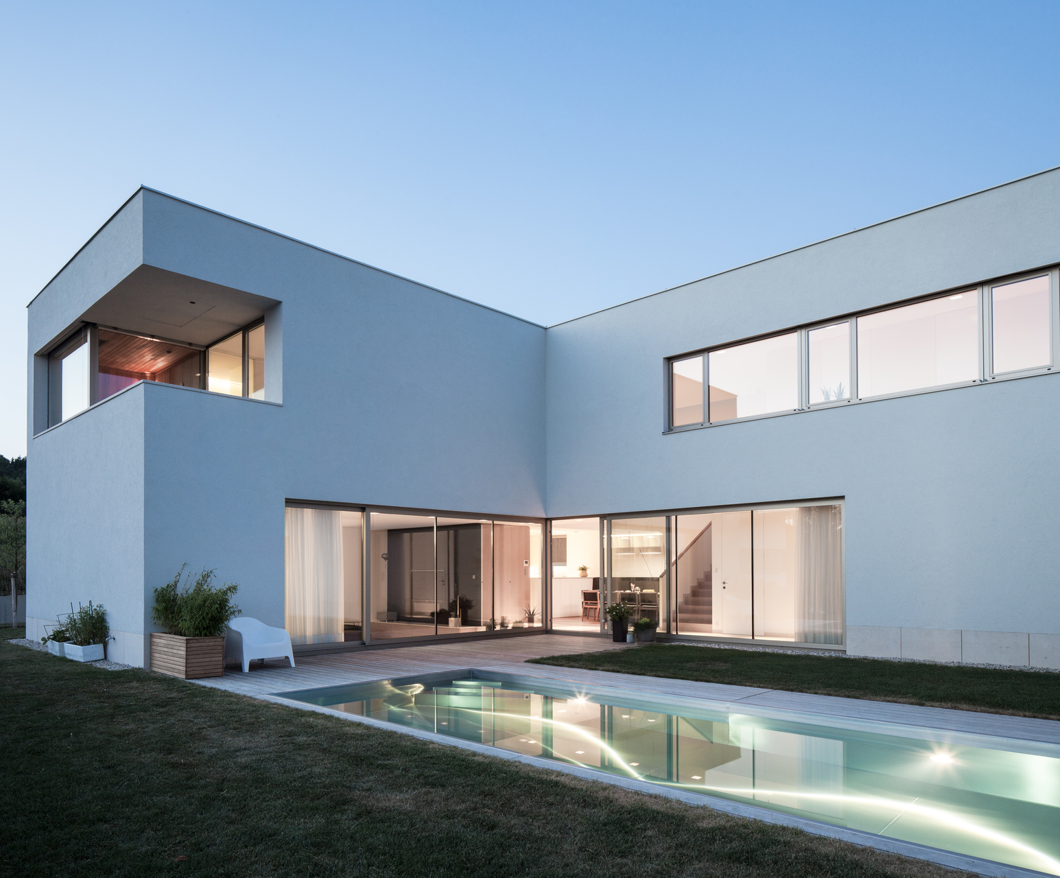 Als Baumaterial kommt der klassische 50er Ziegel zum Einsatz, womit problemlos der Standard eines Niedrigenergiehauses erreicht wird. Großzügig geschnittene Fensteröffnungen Richtung Süden und Westen sowie eine kleine ostseitige Terrasse lenken das Tageslicht ins Gebäudeinnere und rahmen die hügelige Mühlviertler Landschaft. Die innen wie außen weiß verputzten Wände verstärken die Lichtwirkung, im Gebäudeinneren kontrastieren die weißen Wände sanft die hellen Holztöne von Mobiliar und Einbauten. Ein ausgeklügeltes Raumprogramm, edle Materialwahl und die präzise Ausführung bis ins kleinste Detail sorgen für kompromisslose Wohnqualität.