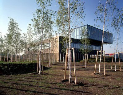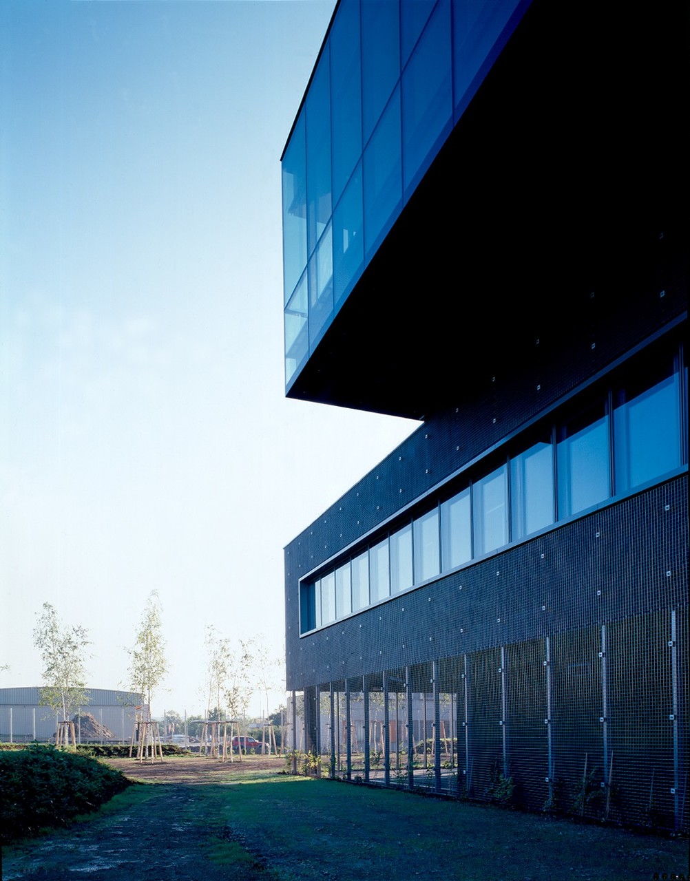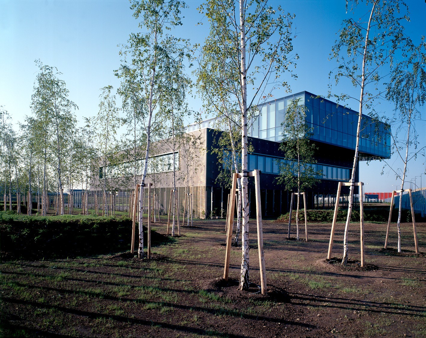 „Das gegebene Grundstück hinter der Autobahnmeisterei ist ein unmöglicher Ort, die Funktion war absolutes Neuland“, sagt Krischanitz. „Ich wollte kein rein technisches Bauwerk entwerfen, es musste metaphorischen Charakter haben.“ Umtost vom Schwerverkehr, eingeklemmt im grünen Keil zwischen A2 und Südosttangente, liegt der 9 m hohe Baukörper wie eine grüne Oase im Auge des Taifuns zwischen drei Autobahnknoten. Präzis sitzt er im Gelände, setzt in disziplinierter Ruhe einen Kontrapunkt gegen das bauliche Chaos rundherum. Zwischen mächtigen Straßentrassen, Emissionen und Lärm leistet das skulpturale Gebäude in stiller Poesie Widerstand gegen die Lieblosigkeit der Peripherie, indem es den Grünraum zelebriert. An der Fassade sind Gitter angebracht, die ersten Efeu-und Weinpflänzchen ranken sich tapfer zum schützenden Schleier hoch. Die Begrünung setzt sich am Flachdach und am Gelände fort. Mittig läuft der Südspitz des bepflanzten Zaunes auf die Sockelzone zu, zwei Reihen Birken im dichten Spalier säumen die Zufahrt, die in der Gebäudeflucht parallel zur Basis des Grundstücks verläuft.