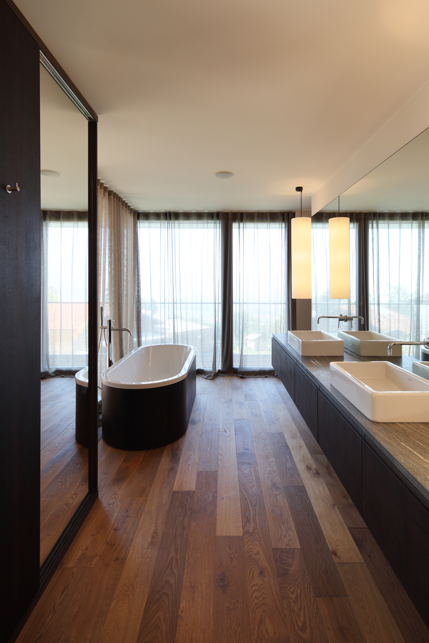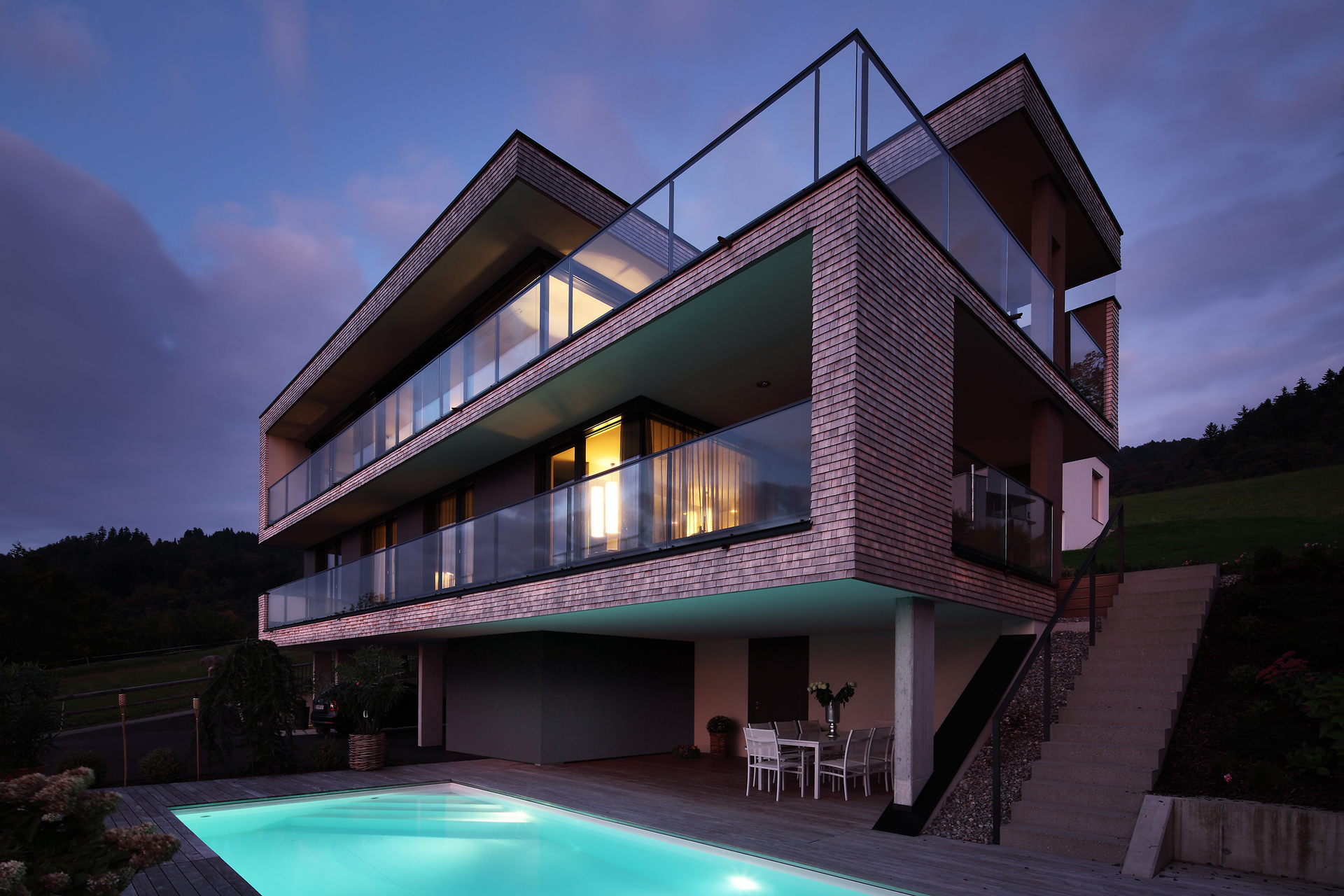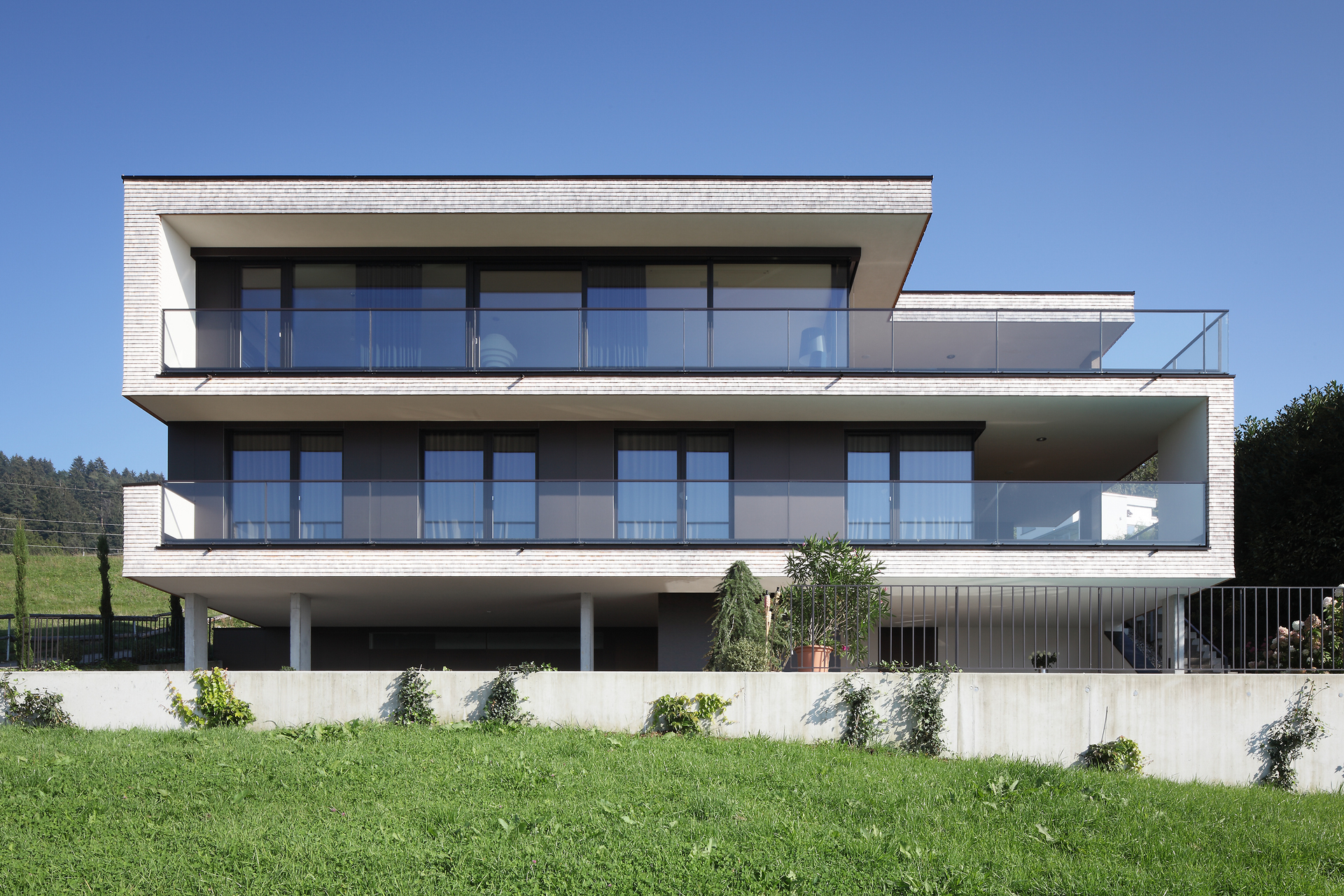 In Richtung Süden und Westen sind dem Gebäude auf ganzer Länge großzügige Balkone und Terrassen vorgelagert, deren Decken und Außenwände die beiden Obergeschosse mit einem S-förmigen Band umschließen und die Hauptfassade strukturieren. Die äußere Fassadenhülle aus Holzschindeln hebt sich deutlich von der zurückversetzten Gebäudeebene mit eloxierten Alupaneelen und raumhohen Verglasungen ab. Eine gläserne Brüstung erlaubt die Aussicht auf den Bodensee, ins Allgäu und auf die Schweizer Voralpen.
