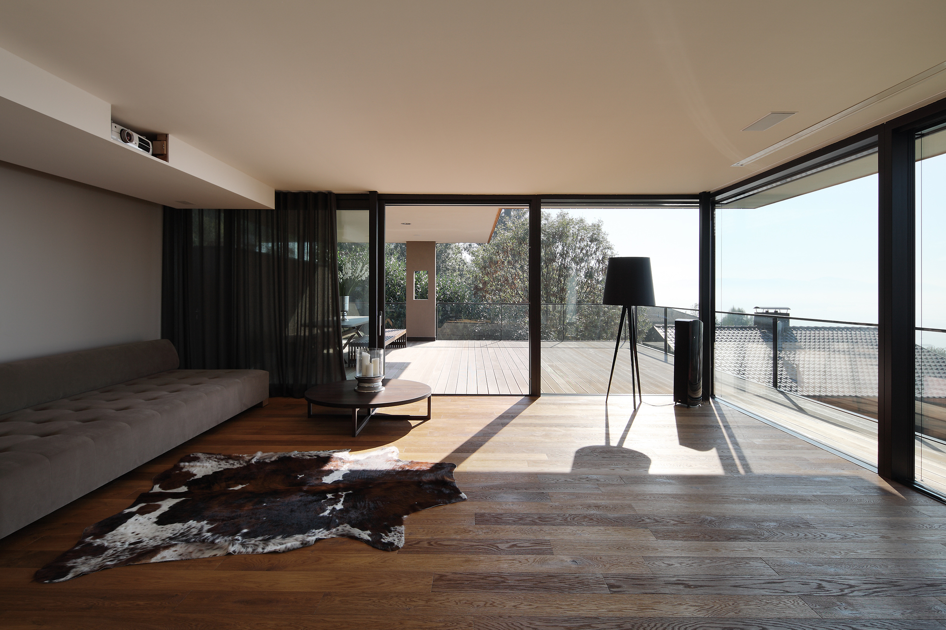 Sämtliche privaten Räume liegen im mittleren Geschoss. Die oberste Ebene wird von einem weiten Raum mit offenen Wohn-, Koch- und Essbereichen gebildet. Das Wohngeschoss ist auf zwei Seiten großflächig verglast, sodass von jedem Punkt aus der Blick in die Landschaft des Dreiländerecks möglich ist. Südseitig schließt eine teilweise überdachte Terrasse an. Wie bereits in den unteren beiden Geschossen sind auch hier die Deckenuntersichten innen wie außen weiß verputzt.