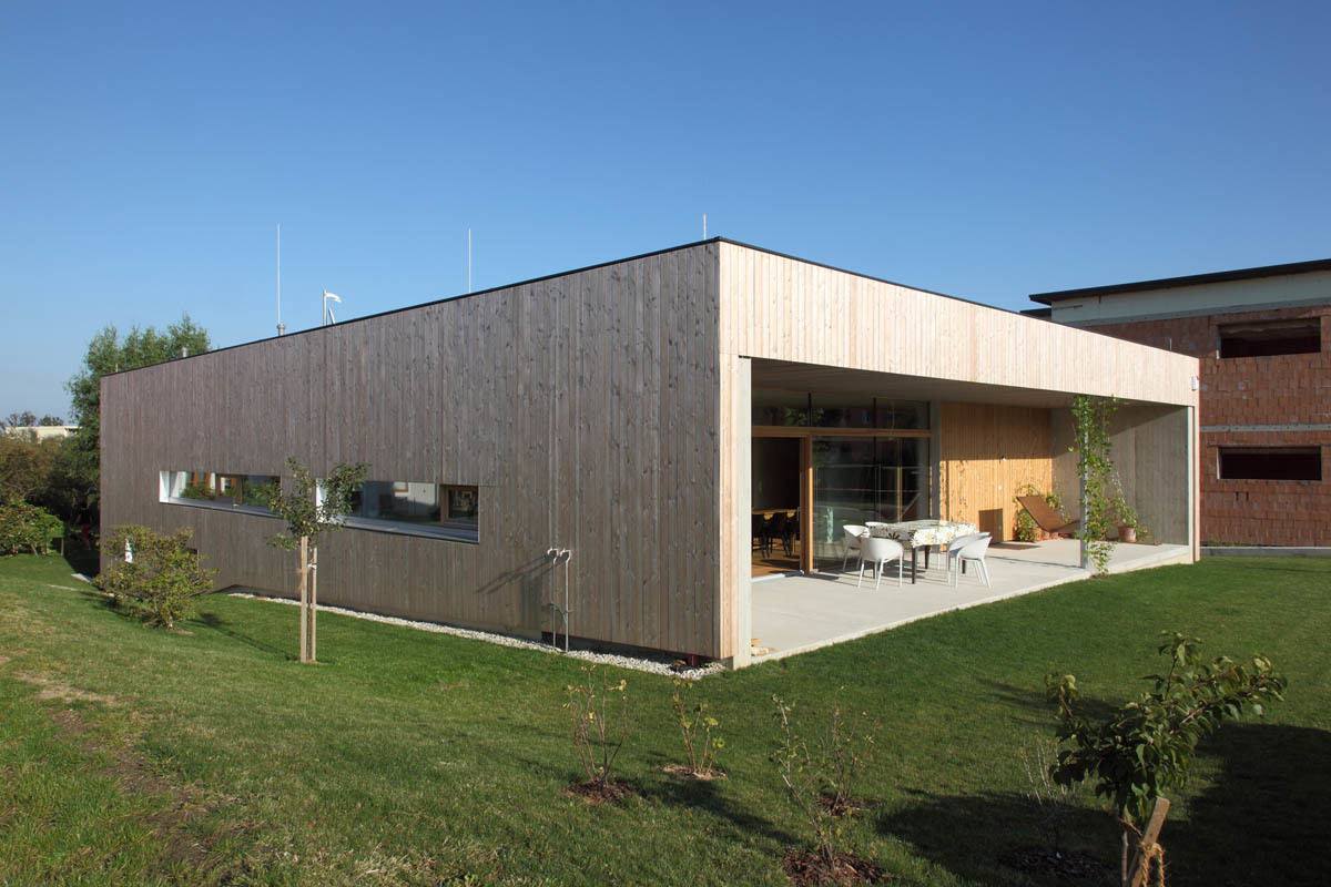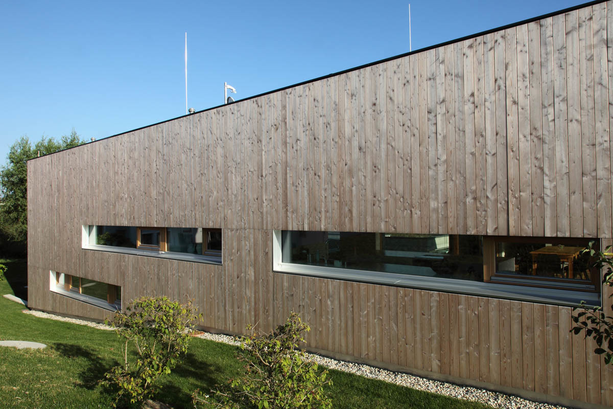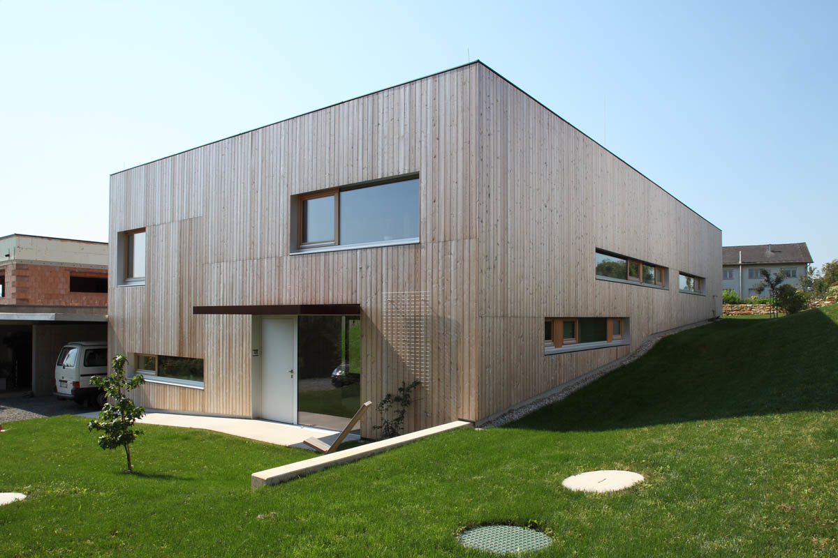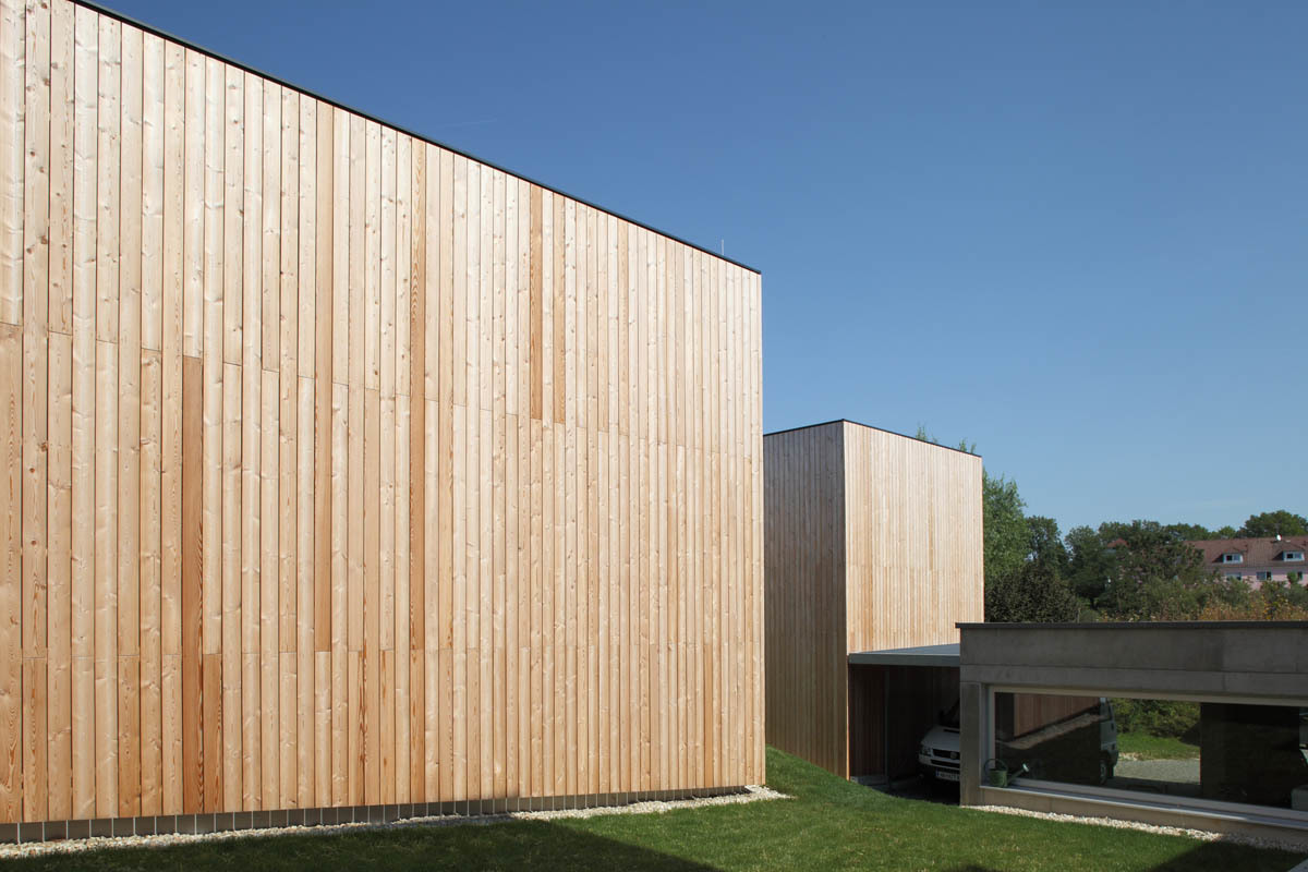 Das gesamte Bauwerk ist in Stahlbetonbauweise ausgeführt. Die massiven, speicherwirksamen Massen sind thermisch umhüllt mit Mineralwolle und einer hinterlüfteten Lärchenbretterschalung. Das Dach ist begrünt, geheizt wird mittels Erdwärme-Tiefenbohrung. Wände / Scheiben / Platten und Träger sind im Innenraum als Sichtbeton in eine Holzstrukturschalung gegossen. Der geölte Lärchenboden ergänzt diese Holzstruktur und flutet den Raum mit warmem Licht. Die Reduktion auf wenige, zeitlose Materialien vermittelt Ruhe und Beständigkeit und schafft die nötige Offenheit für Möbel und Accessoires.