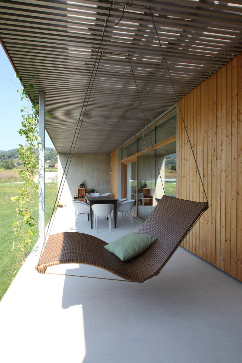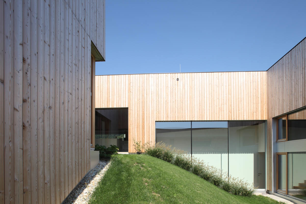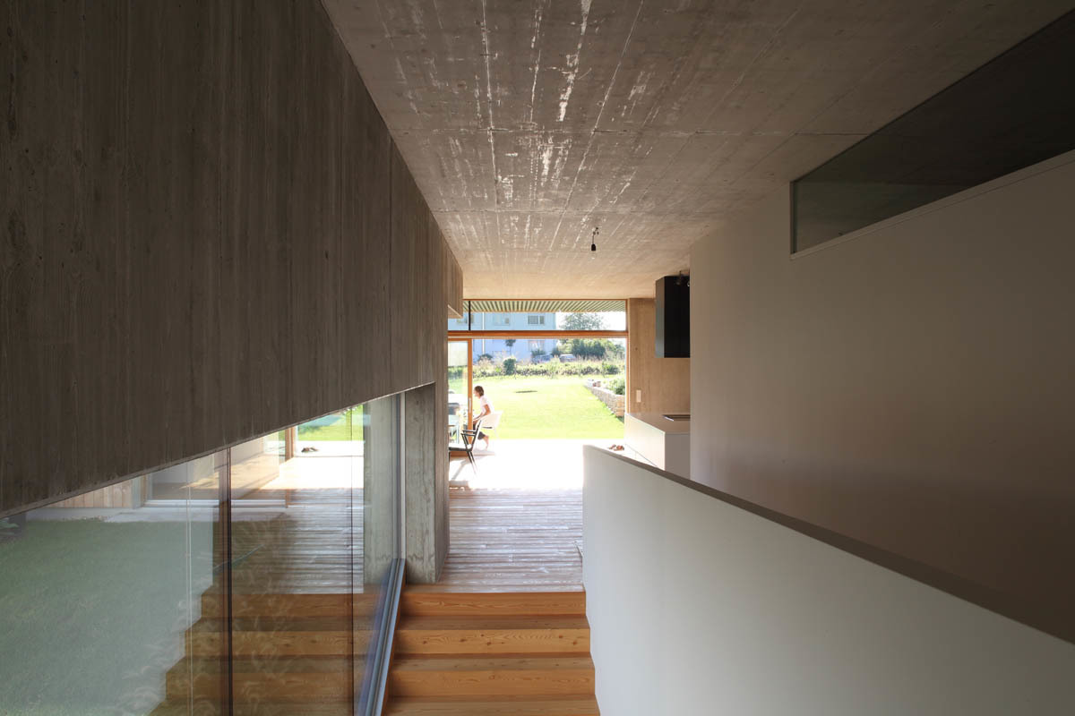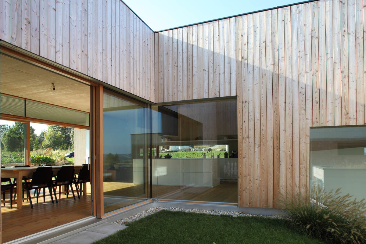 Bei langgestreckten Grundstücksteilungen rücken die vorgesehenen Baufelder nahe aneinander. Um das Nichtbeeinflussbare auszublenden und dem eigenen Qualitätsanspruch zu genügen, nützt die Baumasse die gesamte Fläche der Baugrenzlinien und wird von einem geschützten Innenhof mit Licht durchflutet. Das flachgeneigte Naturgelände bleibt über den Hof auch im Inneren des Hauses spürbar erhalten. Eine 3 Meter Tiefe Loggia über die gesamte Hausbreite verbindet den Wohnbereich mit dem süd-westseitigen Garten.