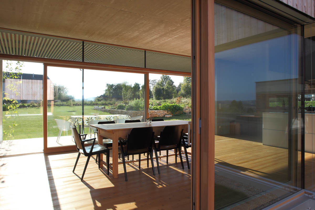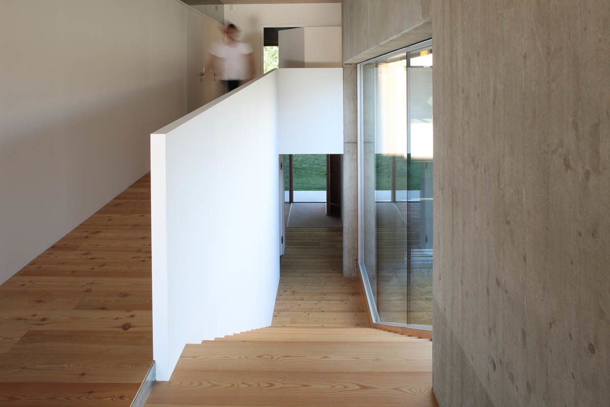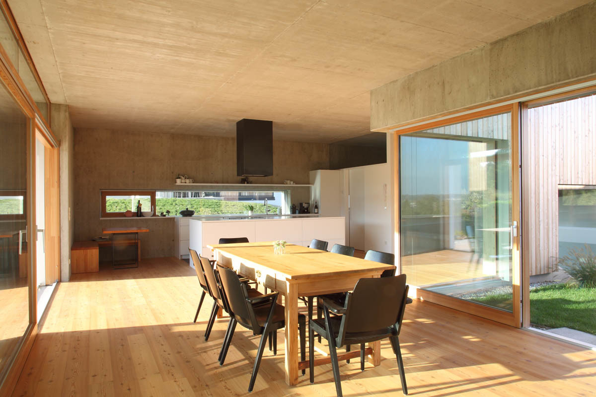 Das Niedertemperaturheizsystem mit Erdwärmepumpe in Kombination mit den großen speicherwirksamen Massen der Sichtbetonwände und Decken erzeugen mit dem geölten Lärchenboden Behaglichkeit bereits bei niedrigeren Raumlufttemperaturen.