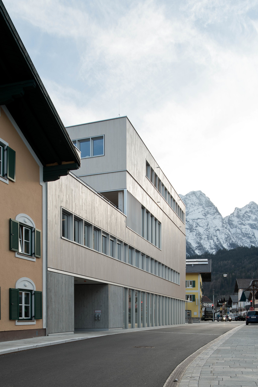 Die weiße Lasur schützt die Holzverkleidung und gibt der „neuen Ortsmitte der Holzgemeinde Kuchl“ seine Identität. Zur Bundesstraße tritt das Gebäude viergeschoßig mit dem markanten Fensterelement des Gemeindesitzungssaals in Erscheinung, mit nur halber Höhe vermittelt es zu den angrenzenden Nachbarbebauungen. Vom Vorplatz im Südwesten lädt eine maximal transparente Eingangsfront in das zweigeschoßige Foyer des Gemeindeamts. Diese zentrale Anlauf- und Kommunikationsstelle vermittelt zum Bürgerservice und Standesamt im Erdgeschoß. Die Loggia zwischen den Büros von Bürgermeister und Bauamtsleiter im ersten Obergeschoß ist öffentlich zugänglich. Dem teilbaren Sitzungssaal im dritten Stockwerk ist eine großzügige Terrasse im Süden mit Blick auf den „Hohen Göll“ vorgelagert. (Text: Norbert Mayr)