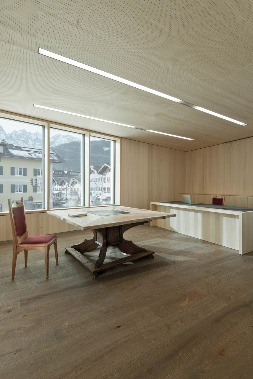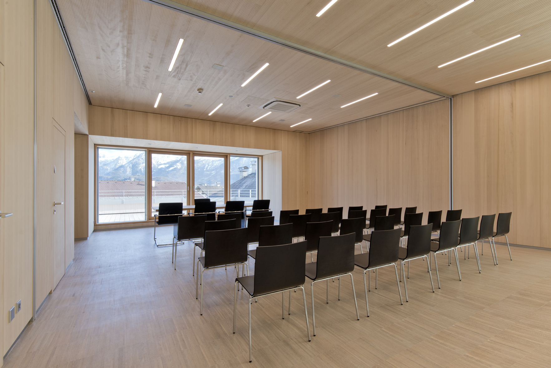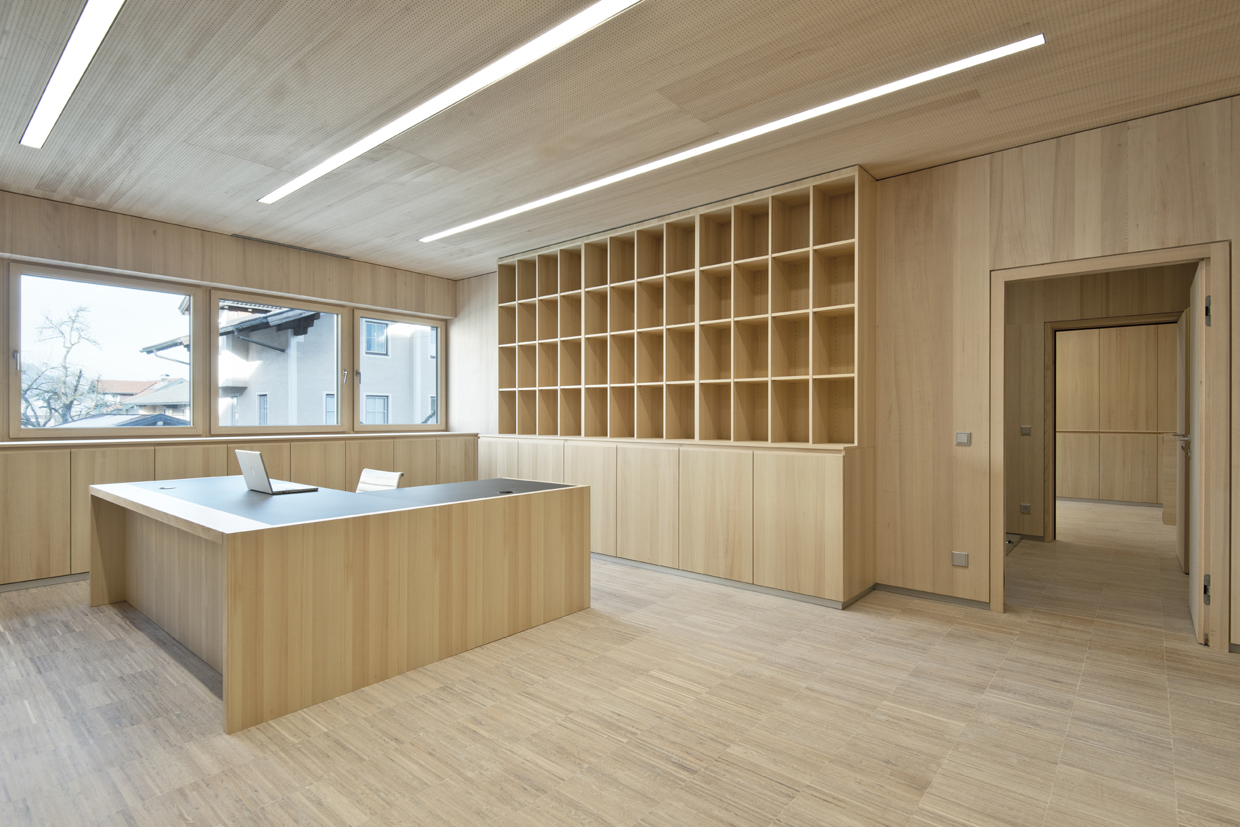 Dieser blieb nicht direkt sichtbar, sondern erhielt Vorsatzschalungen innen (Weißtanne natur) wie außen (Weißtanne, sägerau weiß lasierend): Zu vielfältig und komplex waren bei diesem öffentlichen Gebäude – im Gegensatz zum Projekt Maschinenring (St. Johann im Pongau) – die Anforderungen an sämtliche Bauteile (Schallschutz, Brandschutz, Installationsführung). Bot der Maschinenring mit der Addition gleich großer Bürozellen eine materialsparende Optimierung der Holzbauweise, so wurden in Kuchl die Vorteile des Mischbaus (z.B. im Gemeindesitzungssaal schlanke Stahlträger statt optisch zu hohe Leimbinder) genutzt.
