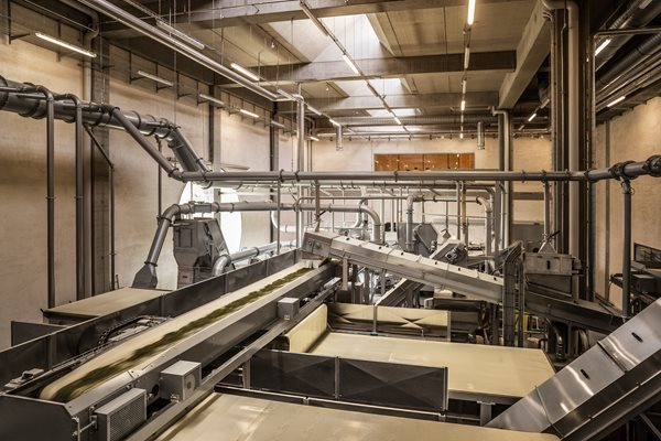 Die »Trägheit« der Lehmblöcke sorgt im Innern für eine konstante Luftfeuchtigkeit von 50 % – im Bereich der Lagerhalle, die die hintere Hälfte des Gebäudes beansprucht, blieb die Lehmhülle innen unbekleidet. Vorne hingegen, wo eine Beheizung – für diese wird die Abwärme der benachbarten Produktionshalle genutzt – nötig war, wurden Backsteinwände eingezogen. Hier befinden sich die Bereiche der Anlieferung und Trocknung, dahinter die Anlagen für das Schneiden und Mixen der Kräuter. Ein Versammlungsraum im OG, der mit ebenfalls von Herzog & de Meuron entworfenen Holzmöbeln und Hängeleuchten ausgestattet ist (eine Vitrine zeigt römische Tonfunde aus der nahen Umgebung), ermöglicht über einige Fenster Einblicke in die Produktionsbereiche.