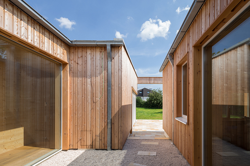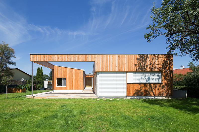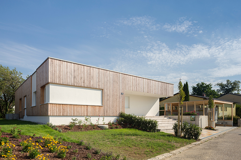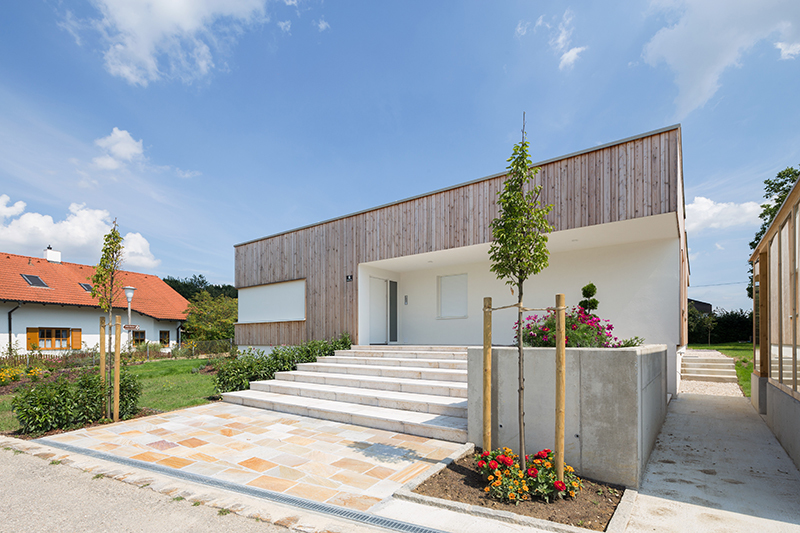 Die Fassade ist ein Spiel mit Fenstern, Putz und Holzverkleidung, das sich um die Hauskanten zieht. Im Eingangsbereich sowie der privaten Freifläche befinden sich Einschnitte in der Kubatur, die das Spiel räumlich fortsetzten.
