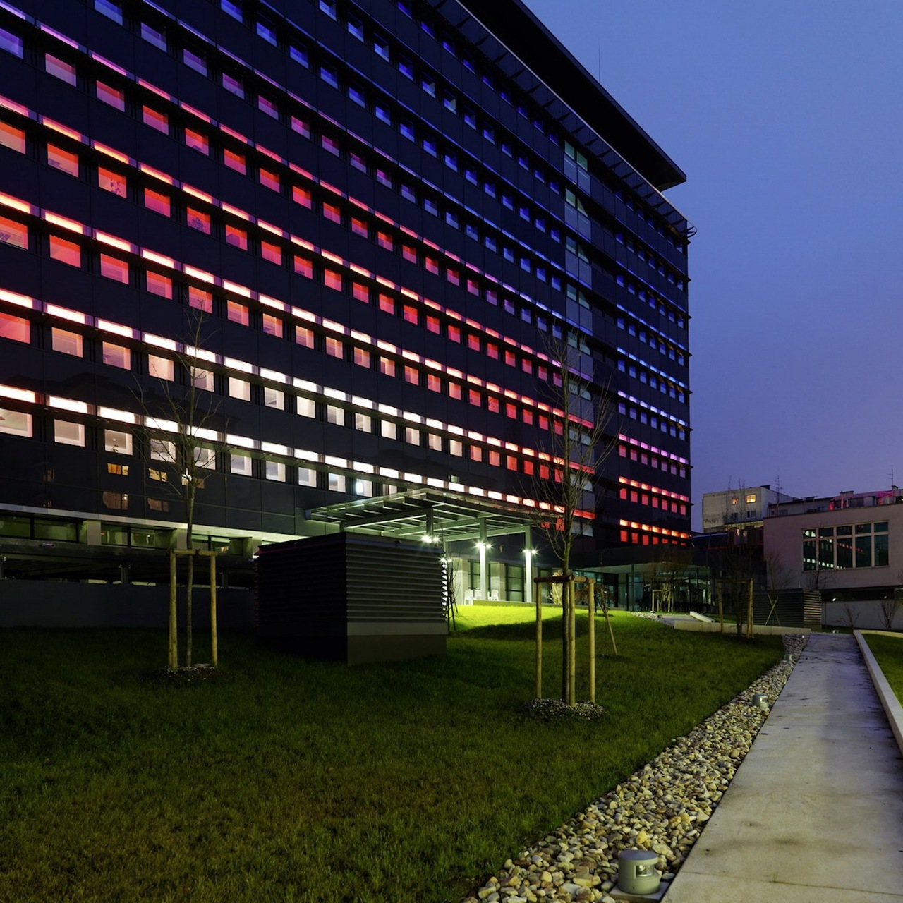 Durch die Erweiterung des bestehenden, bis auf das Stahlbetonskelett entkernten Baus auf beiden Schmalseiten ergaben sich viele sicherheitstechnische Synergien, wie beispielsweise eine deutliche Verbesserung der Fluchtwege. Die Verlängerung des Altbaus bot darüber hinaus die Möglichkeit einer neuen Gesamtgestaltung der Fassade, die über ein ausgeklügeltes LED-System auch in der Nacht hohen Wiedererkennungswert hat. Dabei bot die klare Rhythmisierung der 60er-Jahre-Architektur der Fassadenmodernisierung in technischer wie ästhetischer Hinsicht viele Vorteile.