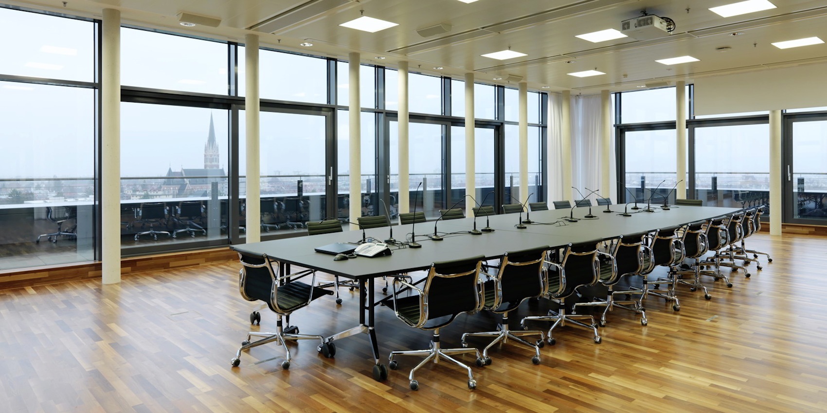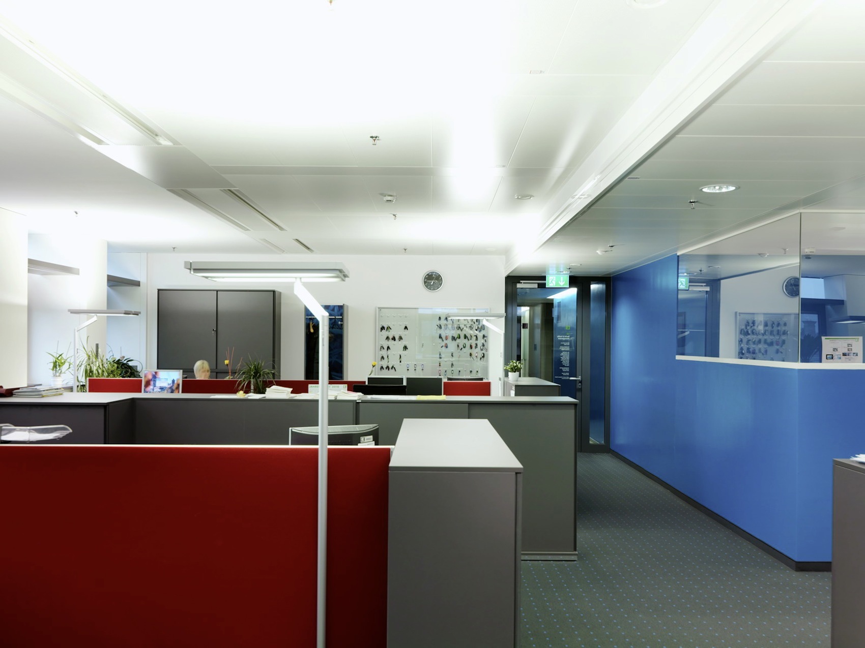 Die freundliche Atmosphäre in den Büroräumen, die von Einzelbüros bis zu Gruppenlösungen variieren, kann durch die Mitarbeiter:innen im Bereich von +/- 2°C mitbestimmt werden. Auch das Öffnen der Fenster ist möglich, jedoch setzt sich bei geöffnetem Fenster die gesamte Heiz- und Kühltechnik automatisch außer Betrieb.