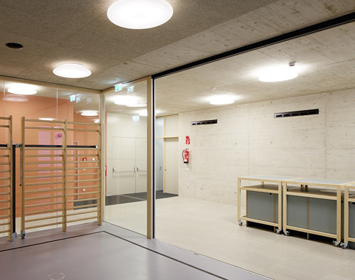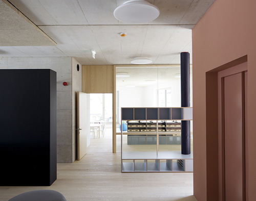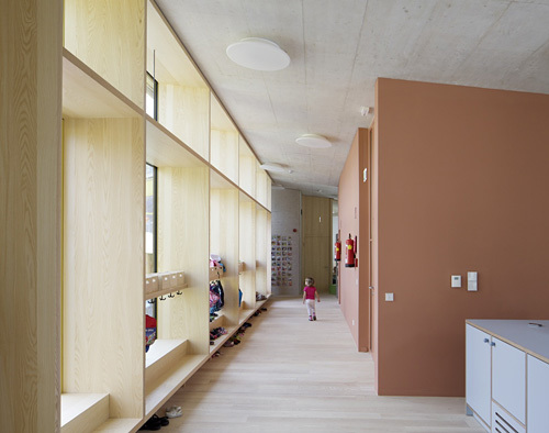 Sämtliche öffentlich nutzbaren Funktionen sind in der Erdgeschosszone angeordnet und funktionieren damit für die Bevölkerung auch unabhängig vom Kindergartenbetrieb. Direkt am Dorfplatz liegt das Café mit Gastgarten, das sich mit dem zentral gelegenen Bewegungsraum, der auch als Pfarrsaal bzw. Veranstaltungssaal genutzt wird, zu einem Ort für Alle verbinden lässt. Im ersten Obergeschoss gruppieren sich die Räumlichkeiten für die Kindergartenkinder rund um den Mittagstisch, im zweiten Obergeschoss befinden sich die Räume für die Kinderkrippe und ein Dachgarten. Großzügige Grundrisslösungen schaffen im Inneren differenzierte Spiel- und Verweilbereiche, die den Kindern zusätzliche Bewegungsflächen bieten. Große Öffnungen in der massiven Hülle geben präzise Blicke in den Ort frei und machen Nähe und Distanz erlebbar. (Text: Claudia Wedekind)