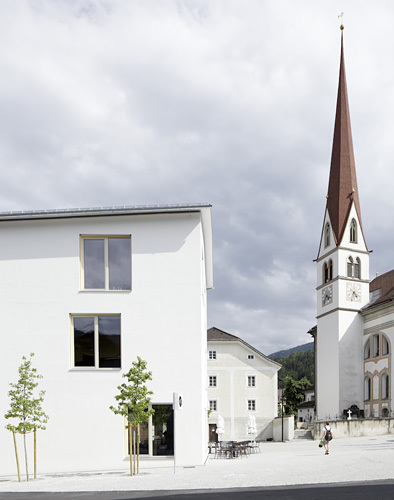 Martin Scharfetter und Robert Rier haben mit ihrem Projekt die Chance ergriffen, für das Dorf eine neue „Mitte“ zu gestalten. Eingebettet in das Ensemble von Kirche, Widum, dem von Erich Guthmorget Ende der 1990er Jahre errichteten Gemeindeamt mit Kindergarten (s. eigener Eintrag) und einem alten, reich verzierten Bauernhof ergänzt das neue „Haus für Kinder“ unaufgeregt die vorhandene bauliche Struktur und formt einen großen Dorfplatz. Die Geometrie des Hauses ist aus der unmittelbaren räumlichen Umgebung entwickelt und nimmt sich gegenüber dem Vorhandenen zurück. Im Dialog mit dem Bestehenden engt sie ein und bildet auf der einen Seite eine Gasse und öffnet sich gleichzeitig Richtung des bestehenden Pfarrgartens, der optisch in den neu geschaffenen Dorfplatz integriert ist.