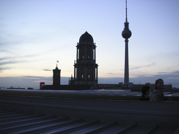 Der geknickte, zwischen den beiden Baukörpern liegende, an beiden Enden offene Raum, der in einer leicht ansteigenden Rampe an der Klosterstraße ansetzt und in einem erhöhten Vorplatz mit freiem Blick auf Rolandufer und Spree mündet, greift die Tradition des Ehrenhofes auf und erzeugt durch dieses wiederkehrende Merkmal der Baugattung einen inhaltlichen Bezug zum Bauprogramm. Die bühnenartig abgesetzte, offene Empfangsterrasse über dem Ufer schafft die protokollarische Sicherheits- und Anstandsdistanz, die zur feierlichen Inszenierung diplomatischer Anlässe gehört, ohne dabei den Bezug zum öffentlichen Stadtraum zu verlieren. Dadurch daß der Durchgangshof beidseitig bebaut ist, erhalten die zum Hof liegenden Innenräume – sowohl im Hauptbau als auch in der äußeren, stumpfwinkligen Randbebauung – überall ein Gegenüber: Die entzweite Baumasse spiegelt sich sozusagen über den Hof in sich selbst. Diese zentrifugale, bzw. zentripetale Ausrichtung der Innenräume auf ein Gegenüber, die sich innerhalb des Grundstückes in einem intimen Maßstab abspielt, schließt nach Osten hin den angrenzenden Straßenraum mit ein und weitet ihre Dynamik gegen Süden schlagartig auf das ganze Spreebecken aus. Zwei weitere Merkmale des Gebäudes unterstreichen diese Wirkung entscheidend: Zum einen der quadratische Grundriß und das prismatische Volumen des freigestellten Hauptbaus an der Ecke Klosterstraße/Rolandufer; des weiteren die Verlegung von Teilen der Haupterschließung des Gebäudes nach außen.