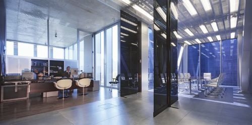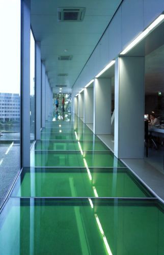Durch sein kubisches Volumen vermeidet der Hauptbaukörper jegliche eindeutige Orientierung, wird zur Drehangel und verhält sich dadurch unterschiedslos gegenüber den verschiedenen räumlichen Situationen seiner Umgebung. Paradoxerweise scheint es gerade diese Loslösung des Hauptbaus aus dem Verbund der Blockrandbebauung zu sein, die den Bezug zur städtischen Umgebung intensiviert. Der geschwungene Anfahrtsweg zur äußeren Empfangsterrasse steigert sich im Inneren des Gebäudes zu einer spiralförmigen Abfolge von Rampen, Treppen, Fluren und Foyerräumen, die von Geschoß zu Geschoß sämtliche Fassadenflächen nacheinander streift, so daß immer wieder Ausblicke entstehen, die sich, nach verschiedenen Richtungswechseln, schließlich zu einem Rundumblick auf die Stadt zusammensetzen. Auf der Dachterrasse können die beim Abschreiten des Gebäudes gewonnenen Einzelbilder des Stadtpanoramas schließlich zu einem Gesamtbild gefügt werden.