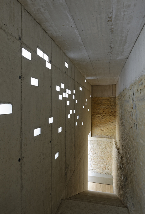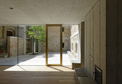 An dieser Stelle kann man das räumliche Gefüge sofort überblicken. Links im neuen Betonriegel liegen Gästezimmer, rechts hinter einer in der Textur des Mauerwerks durchlöcherten Wand liegt die Treppe vom Hof abgetrennt. Die Betonwand verdoppelt die Außenmauer, das Licht sickert durch die Löcher im Beton ein. Am unteren Austritt öffnet sich die Weite des Salons, die ganze Dimension der ausgehöhlten Ruine ist spürbar. Schützend begrenzt das neue Haus als Brücke den Raum nach oben, ein Betonofen trennt den introvertierten Ort der Ruhe vom Erker ab, welcher einen Wechsel in eine andere Atmosphäre anbietet. Er liegt nicht nur außerhalb der alten Mauern, sondern bezieht sich mit gezielten Ausblicken voll und ganz auf das Außen. Er lässt den Blick übers Wasser der Enns schweifen.