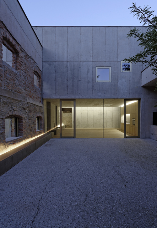 Im eingefassten Garten steht das solitäre Bauernhaus, oder besser gesagt, das was davon übrig ist. Kindheitserinnerungen an Ruinen kommen einem in den Sinn. Die stehengebliebenen Außenmauern erzeugen einen großen Innenhof, in dem wiederum der neue Baukörper eingefügt wurde. Ein Haus im Haus also. Zwei Höfe, die sich unter dem kleinen Haus zu einem Raum verbinden.