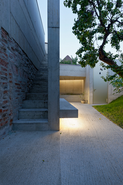 Die neue Gartenmauer zeichnet die enge Flucht der Haratzmüllerstraße nach, sie betont die Schwelle und springt auf Höhe des Zollhausgiebels zurück. Dadurch entsteht die Andeutung eines Platzes, der Bildstock sitzt nun wieder am Platz und der Zugang zum Gartenhaus, das man von hier nur als über die Mauer hinausragendes üppiges Grün verspürt, tritt klar, aber unaufgeregt als Platzecke in Erscheinung. Die wandhohe Tür aus Messing führt ein paar Stufen unterhalb hinein in den Eingangshof.