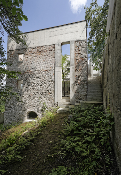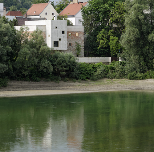 Das neue Gebäude in sichtbar belassenem Beton durchdringt die alten Mauern aus Flusssteinen und Vollziegeln. Es zitiert am Ennsufer die historisch typischen Ausblickserker, deren Bedeutung im Überblick auf die Ländeflächen für Flosse lag. Das Ufer war früher der Hafen der Stadt. Straßenseitig bildet der Vorsprung eine Schlucht zwischen Mauerwerk und Betonwand aus, in dem eine schmale Treppe auf die Sonnenterrasse hoch führt. Die Stirnfläche des neuen Hauses trägt die Hausbank im Eingangshof. Unter einem Vordach, durch dessen Spalt an der Rückwand bei Regenwetter die dort hin geleiteten Dachwässer herunterfallen, steht ein Trog. Er sammelt Wasser für den Kräutergarten und kann als Kalter für Fische dienen. Von hier aus führt der Weg durch die alte Außenmauer direkt in den kleineren der verbliebenen Höfe der Ruine. Er ist glasüberdacht.
