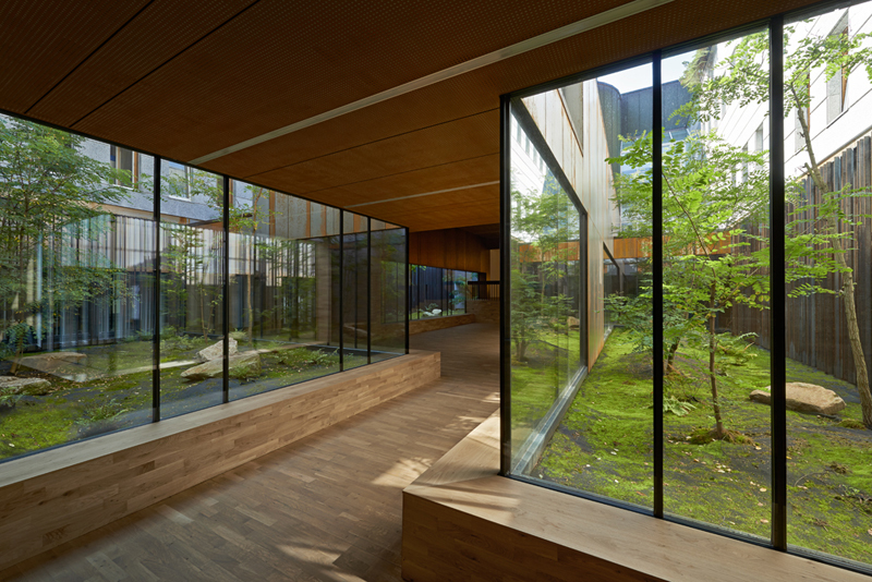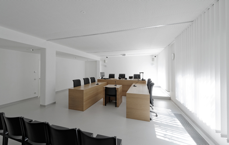Im Kontrast dazu sind die Verhandlungssäle als Orte der Konzentration gestimmt. Sie sind weiß gefärbt und nutzen das Licht der umliegenden Patios. Stahllamellen vor den Fenstern schützen vor Durchblicken der draußen Wartenden. Die Pulte sind in Eichenholz ausgeführt, ihre Haptik und Schwere verleihen dem Geschehen Würde.