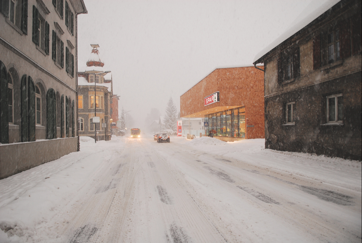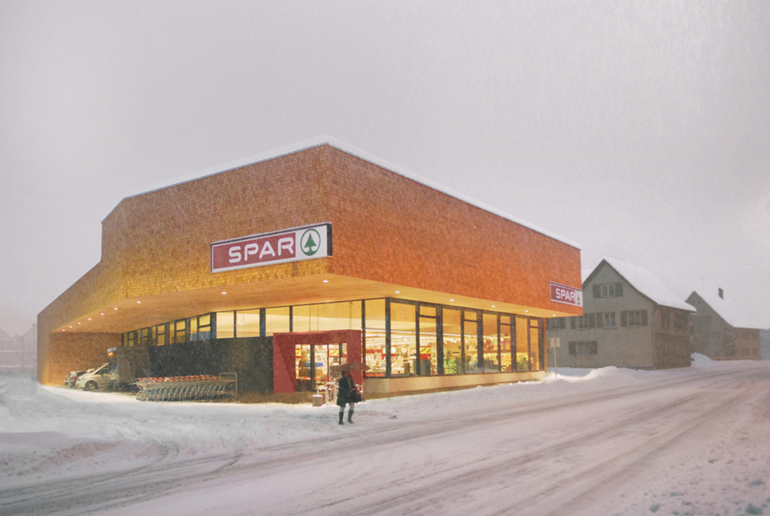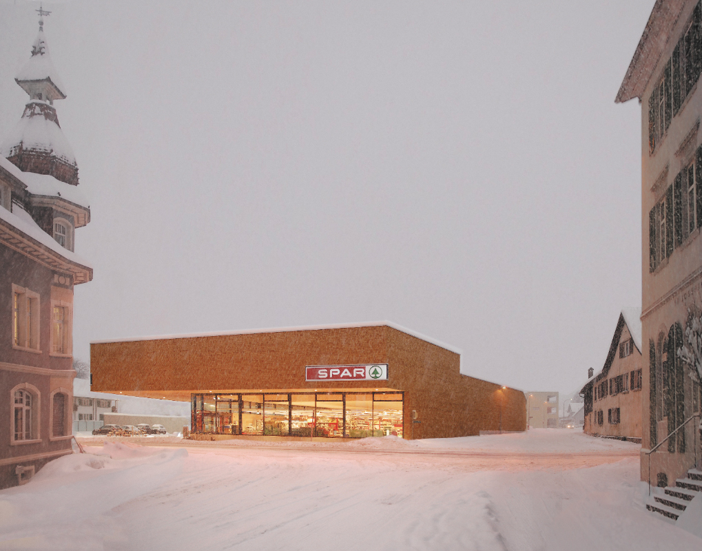 In Richtung Hauptstraße springt der Baukörper in der Erdgeschosszone zurück und schafft einen überdachten Zugang. Durch großflächige Verglasungen nach Westen und Süden gelangt viel Tageslicht in den überhöhten Empfangs- und Kassenbereich. Oberlichten leiten die Morgensonne in die Markthalle. Die Fassade des in Holzbauweise ausgeführten Gebäudes ist komplett in heimischer Lärche geschindelt. Wände und Decken des offen gestalteten Verkaufsraums sind mit Seekiefernplatten verkleidet. Diese bilden auch die Untersicht der Dachauskragung und verbinden somit Innen mit Außen.