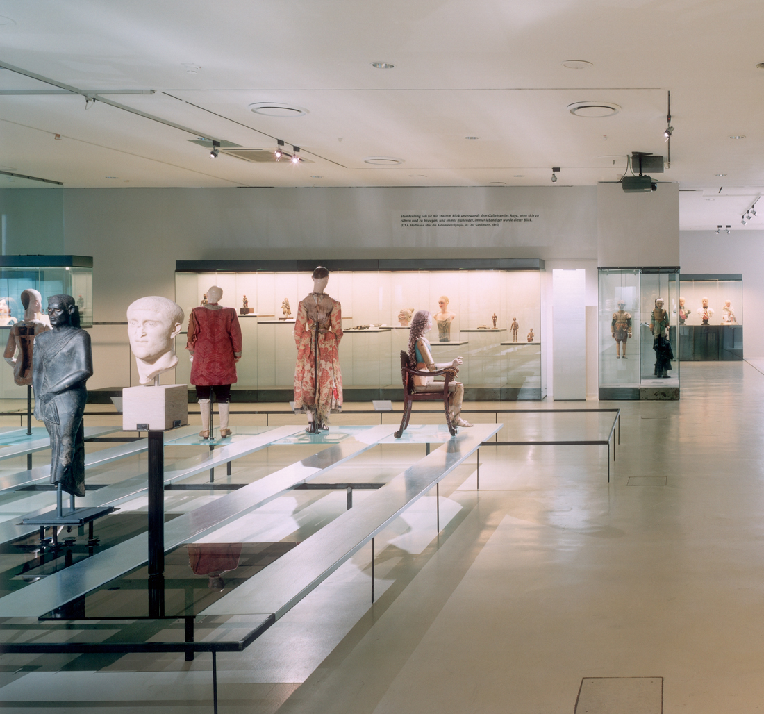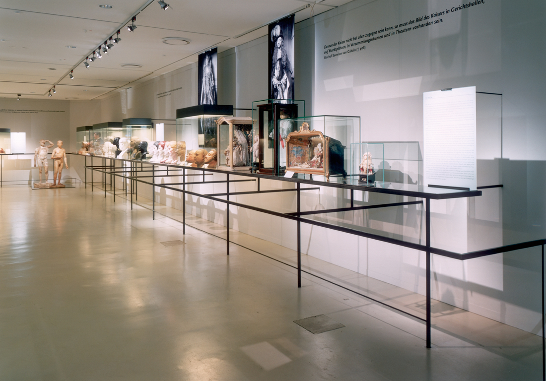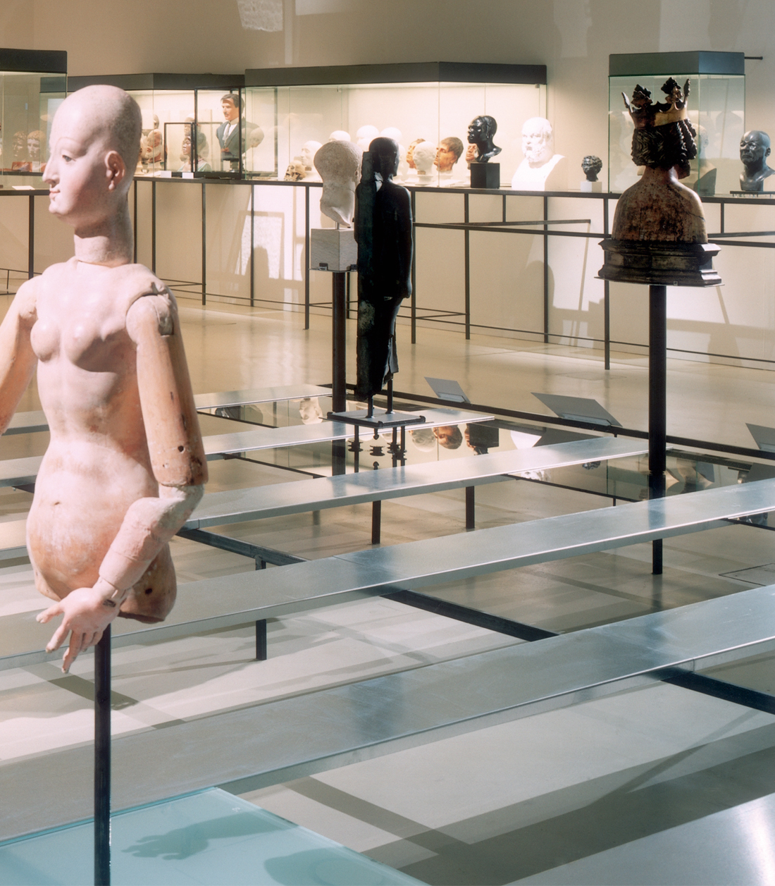 Auf der rechten Raumseite sind auf einem schmalen Bord Reliquare und Abformungen menschlicher Köpfe seriell angeordnet. Die auf durchsichtigen, farbigen Glasböden präsentierten Exponate werfen verschiedenfarbige Schatten auf die rückwärtige Wand und den Fußboden. Die feingliedrige Rahmenkonstruktion ist auf ihre Hauptfunktionen reduziert: Tragen, Abstand schaffen, die Objekte auf die Sichthöhe der Besucher bringen.