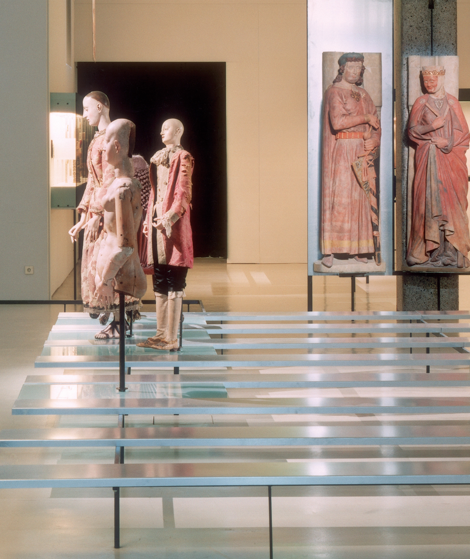 Ein großes, in parallele Streifen gegliedertes Podest führt in den Raum und betont die Eingangsrichtung. Über das Podest „ziehen“ Skulpturen zu zwei mittelalterlichen „Säulenheiligen“, die von einer Gebäudestütze auskragen. Die dreidimensionalen Objekte sind auf gläsernen Brücken, mit Distanz zu den Besuchern, zwischen Bahnen aus verzinktem Stahlblech eingefügt. Parallel dazu wird ein Filmausschnitt, der eine sich in ruckhaften, „hölzernen“ Schritten bewegende Mönchs-Marionette zeigt, auf die Wand neben der Figurengruppe projiziert.