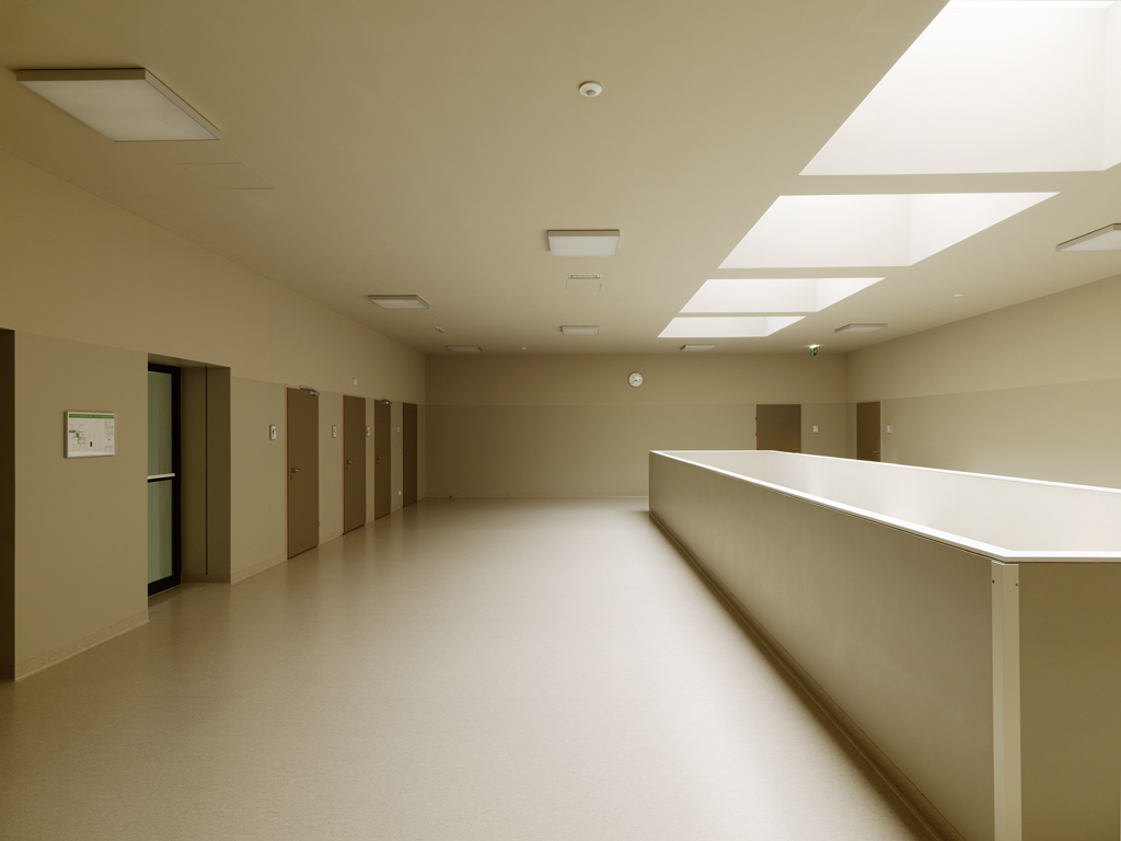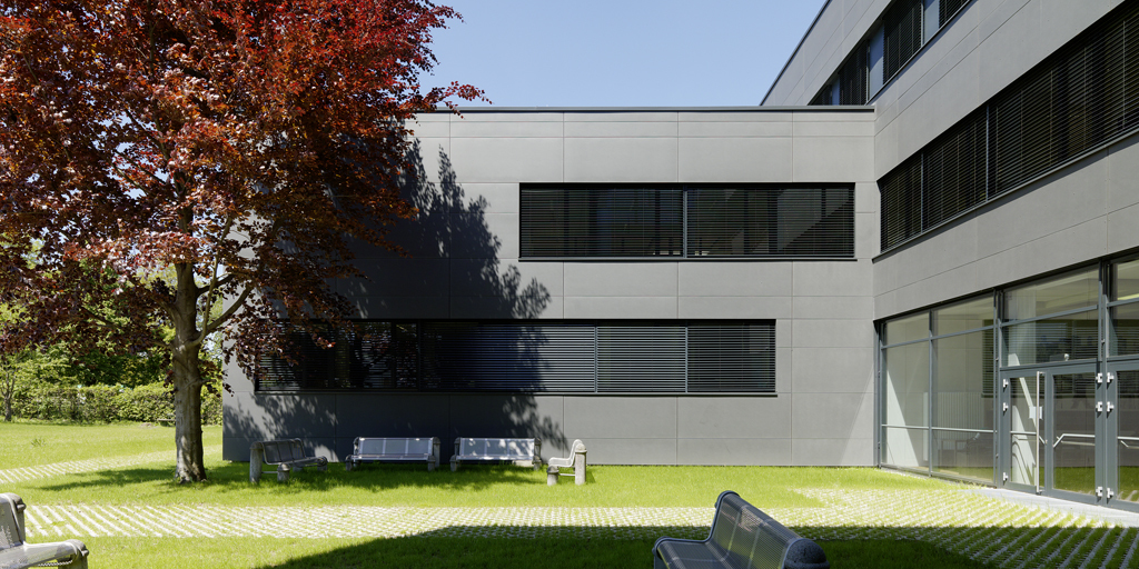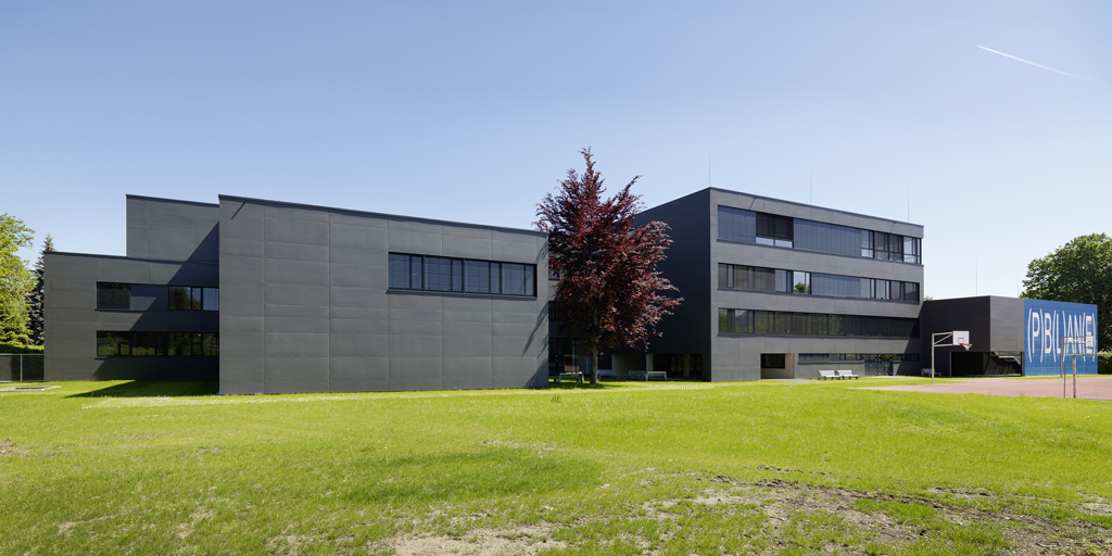 Eine neue hochgedämmte Gebäudehülle aus vorgehängten Holzfertigteilen, verkleidet mit anthrazitfarbenen Faserzementplatten verbindet alle Bauetappen zu einer gemeinsamen Einheit; durch unterschiedliche Ausformulierung der Fensterbänder bleiben die einzelnen Baustufen subtil sichtbar. Ein neu vorgestelltes Eingangsgebäude schafft einen klaren Zugang und führt in der Farbigkeit die zurückhaltende Gestaltung der 1970er Jahre nach außen.