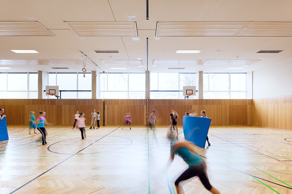 Die Klassenräume selbst wurden mit neuen Oberflächen ausgestattet; eine adäquate Raumakustik unterstützt das Lernen in unterschiedlichsten Szenarien. Die beiden vorhandenen Turnsäle wurden bis auf den Rohbau zurückgebaut und mit einem neuen Kleid den aktuellen Anforderungen entsprechend ausgebaut. In der Farbigkeit nehmen sich die Räume zurück und sorgen mit einem warmen Grundton in den Klassenräumen für angenehme Aufenthaltsqualitäten. Die durchaus spröde Farbigkeit der 1970er in den Gängen und Hallen in grau-weiß wird durch die vorhandenen orangen Farbtupfer aufgelockert. Die Buntheit wird durch den Schulalltag in das Gebäude hineingetragen. (Text: Architekt)