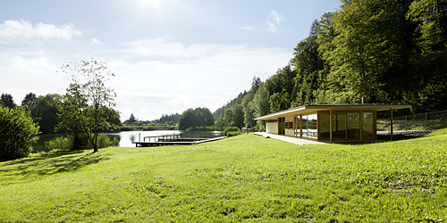 Im Zentrum der Anlage steht der Empfangsbereich. Er eröffnet den Vorbeiwandernden überraschend einen gerahmten Bildausschnitt des Sees, die Bauwerkslänge ist gebrochen. Für die Badenden thematisiert diese Schwelle den Übergang. Das Tor als Raum ist Aufenthaltsbereich. Zur linken, also Richtung Westen, schliessen an diese gedeckte Vorhalle das Buffet mit Kassa und Lager an, ganz im Westen, zweiseitig umgeben von gedeckten Terrassen und rundum Ausblick bietend, ist der Gastraum platziert. Direkt am Eingangsbereich liegt der Notfallsraum der ÖWR, anschliessend an diesen die Sanitäreinrichtungen. (Text: Architekten)