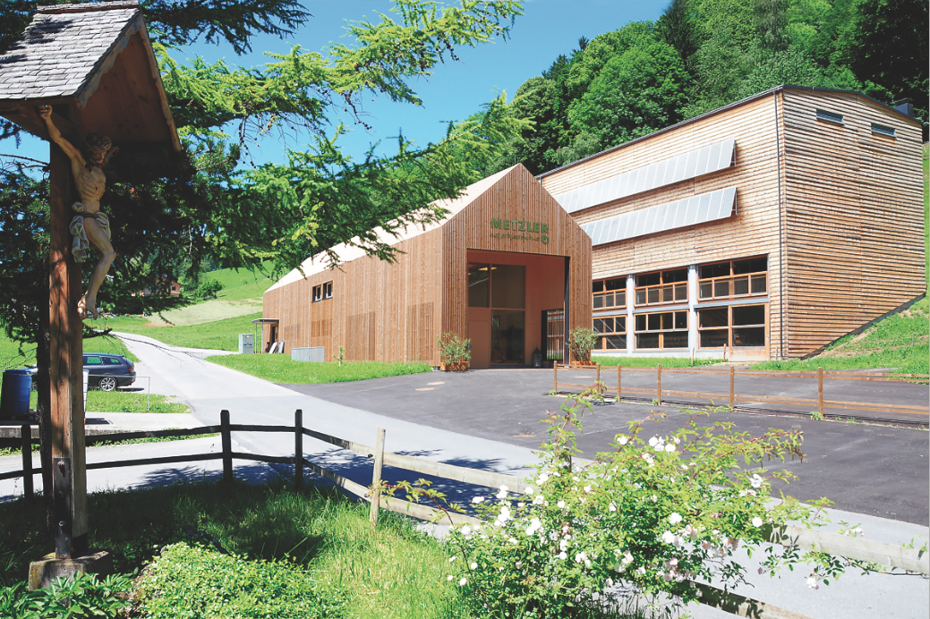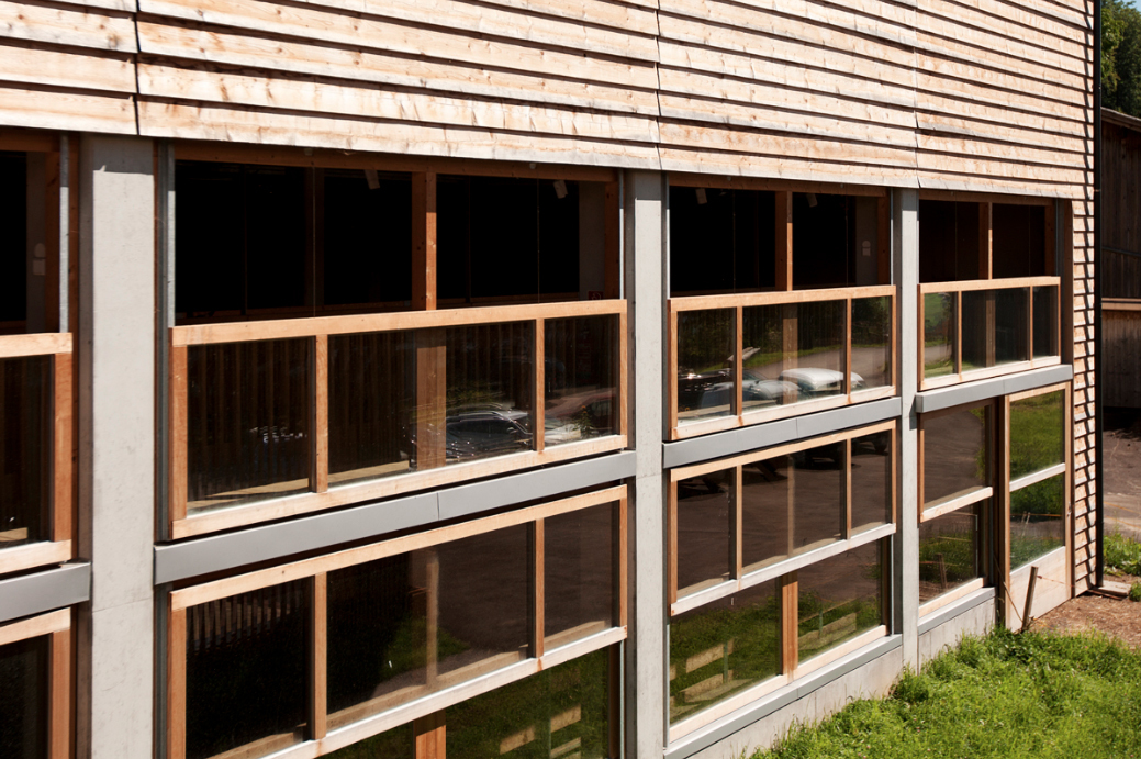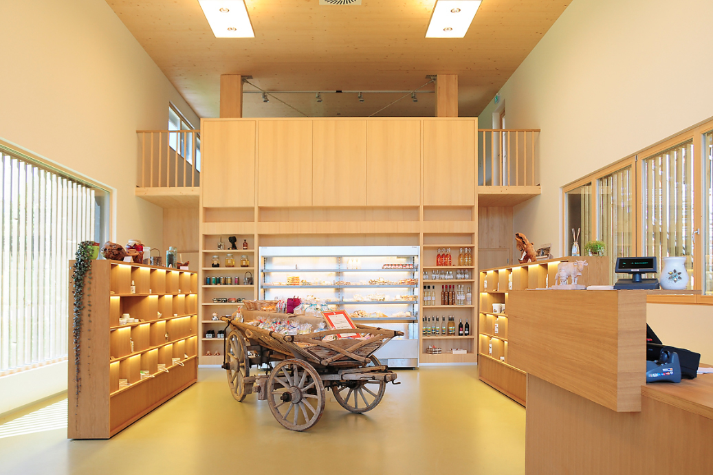 Die Bauten ungleicher Größe und Kubatur verweisen auf unterschiedliche Funktionen. Im vorderen Gebäude mit einem einladenden, großzügigen Eingangsbereich befinden sich Hofladen, Sennerei und Reifekeller. Die Fassade aus vertikal angeordneten Fichtenholzleisten mit offenen Fugen setzt sich am Dach fort. Über eine Verbindungsbrücke gelangen Besucher des Bauernhofs in das dem Hang zugewandte Stallgebäude. Der moderne Stall mit Sichtbetonwänden und großzügigen Glasflächen Richtung Süden besitzt eine horizontal verlaufende Stülpschalung aus Fichtenholz. Unter dem Dach, oberhalb der Ställe, befindet sich die Heutrocknungsanlage mit Heulager. Die Hanglage des Baus erlaubt es, jedes Geschoß „ebenerdig“ anzufahren.