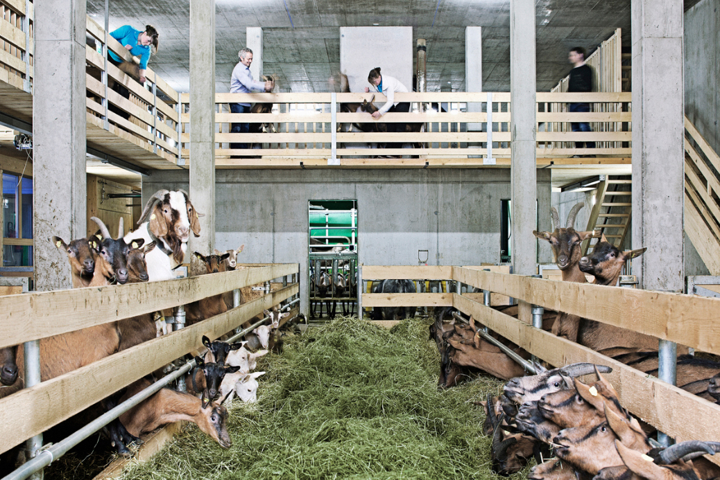 Den Wunsch nach einer integrierten Besucherführung löste man mit einer Galerieebene, von der aus die Sennerei, die Ställe und der Melkstand einsichtig sind. Um den Arbeitsablauf nicht zu stören, bewegen sich die Besucher nur in den für sie vorgesehenen Bereichen. Im Stall gelangen die Ziegen über Rampen auch auf die Besuchergalerie. Dort können sie gefüttert und gestreichelt werden.