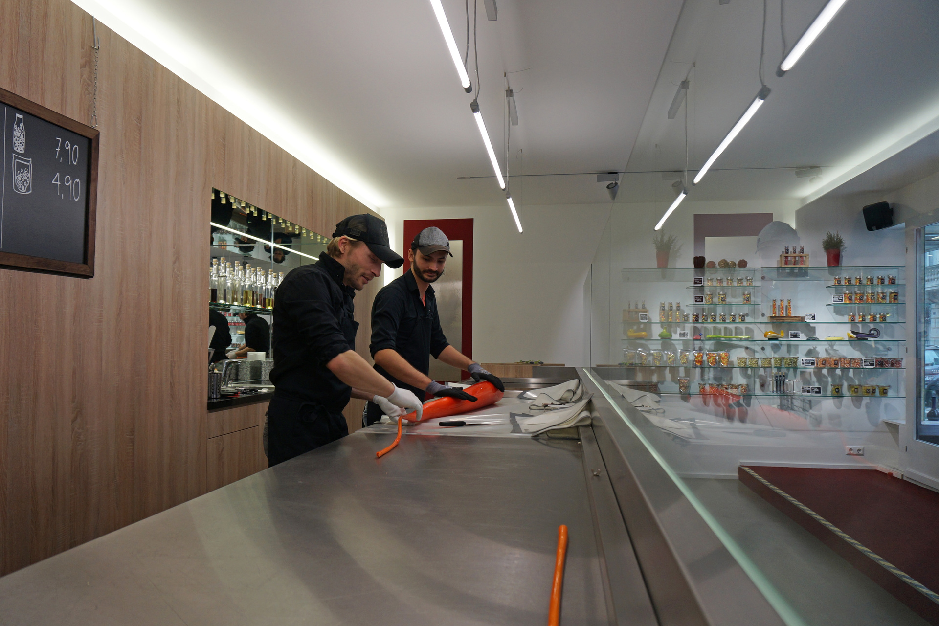 Das reduzierte Shop-Design wurde in intensiver Zusammenarbeit mit den beiden Auftraggebern entwickelt. Zentrales Möbel ist die 5,2 m lange Produktionsstraße im Verkaufsraum, auf der die Zuckerstränge verarbeitet werden. Der Produktionsstraße vorgelagert befindet sich eine Glaswand, die einer behördlichen Auflage geschuldet ist: Sie bildet einen Spuckschutz. An den Seitenwänden im Verkaufsraum befinden sich Wandhaken, die man leicht übersieht, wenn sie nicht gerade im Gebrauch sind. An den Haken werden die meterlangen Zuckerstränge in wiederholten Arbeitsschritten in die Länge gezogen. Die Inszenierung wirkt bis hinaus in den Straßenraum, wo die Laufkundschaft vor der gläserne Geschäftsfront zum Publikum wird.
