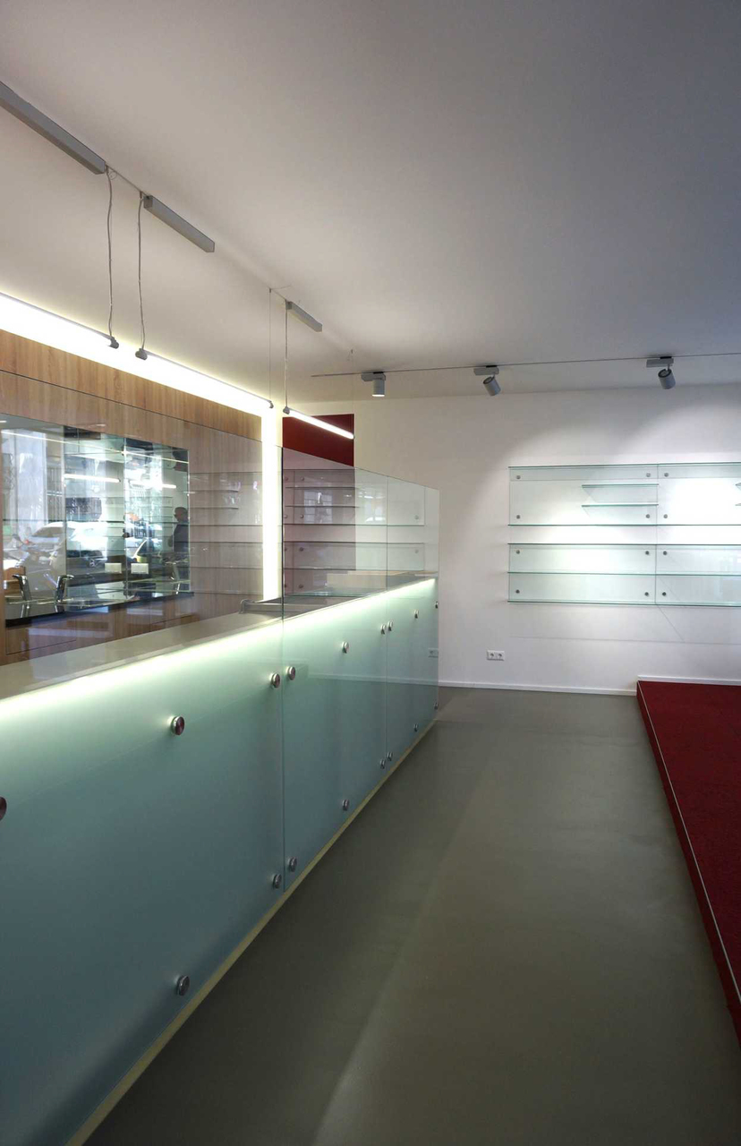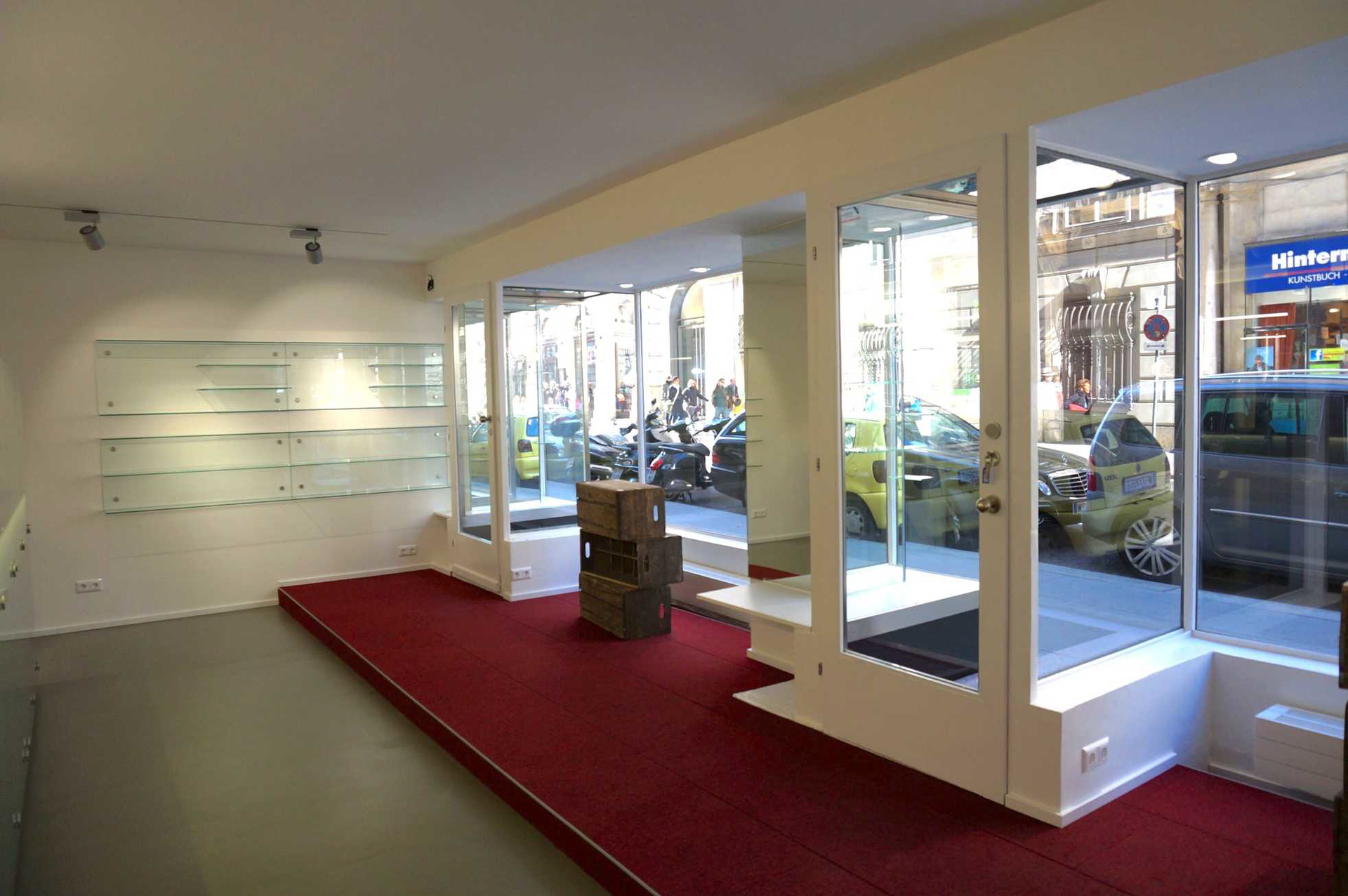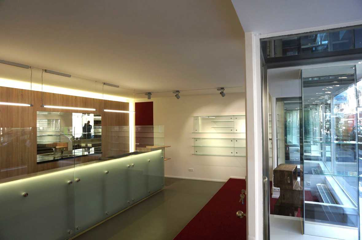 Nach außen präsentiert sich die Ladenfront in der Herrengasse mit einem einheitlichen, denkmalgeschützten Erscheinungsbild. In den Geschäften drinnen hat die Architektur von Theiss und Jaksch im Laufe der Jahrzehnte jedoch zahlreiche Umgestaltungen erlebt bzw. erlitten. Im Zuge des Umbaus wurde das Geschäftslokal von allen nicht tragenden Zwischenwänden und Einbauten befreit. Unverzichtbare Einbauten wurden als Schrank- und Glaswände realisiert. Im hinteren Bereich befinden sich, für Kunden nicht einsehbar, die Produktions- und Nebenräume (Büro, Lager, Sanitärräume, Küche).