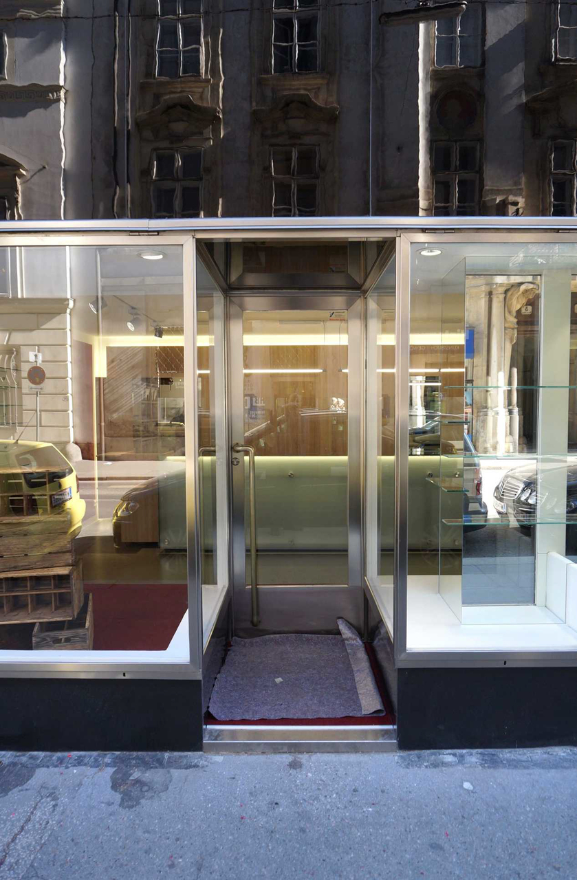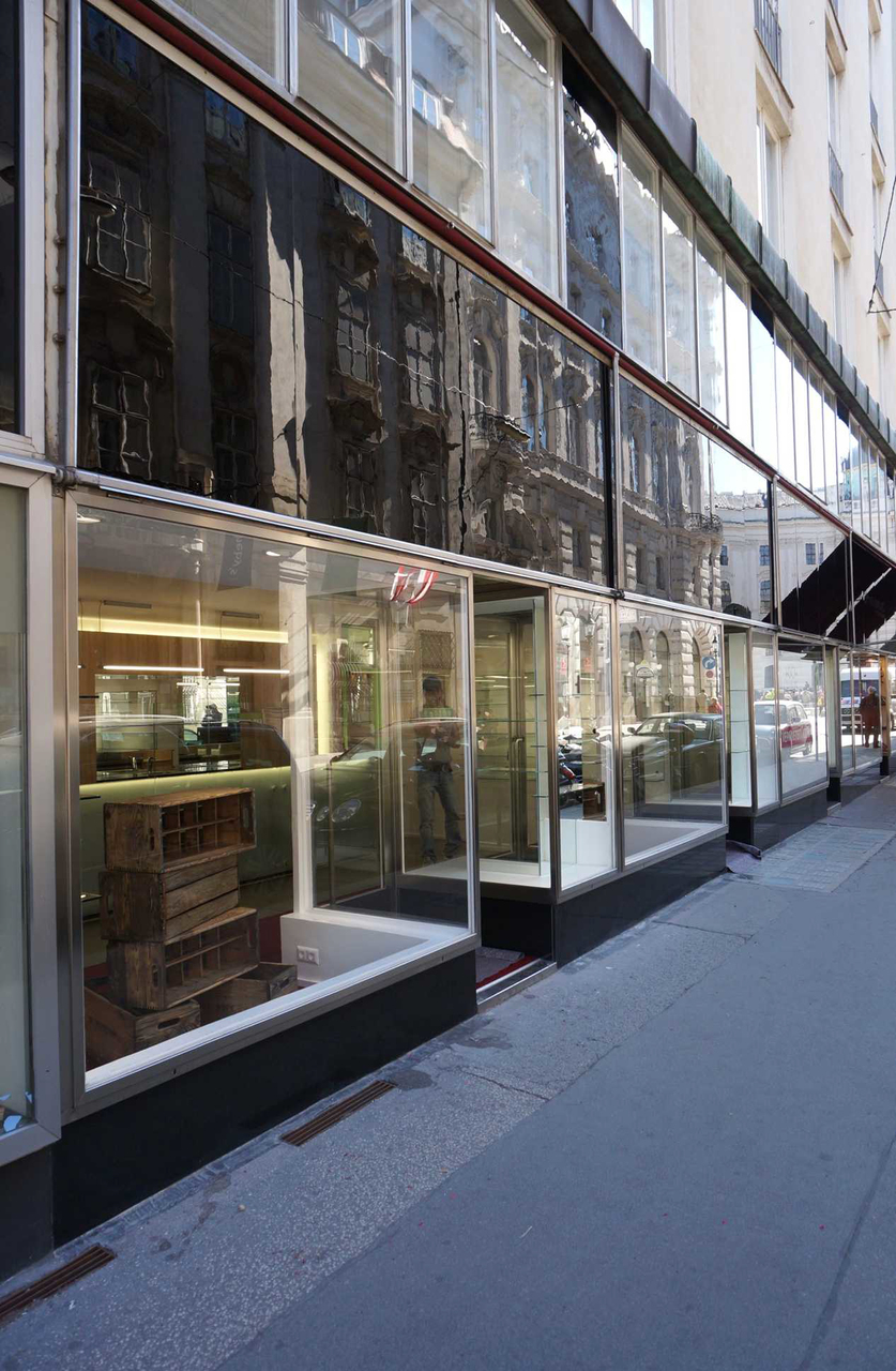 In den Schaufenstern wird die Ware auf gestapelten Weinkisten aus dem Weinviertel präsentiert. Die Kisten sind dem Budget geschuldet – die baulichen Maßnahmen für die Erfüllung aller Auflagen sind kostenintensiv. Darüberhinaus statten sie das Geschäft an diesem architekturhistorisch bedeutsamen Standort mit einer willkommenen Portion Patina aus. (Text: Martina Frühwirth)