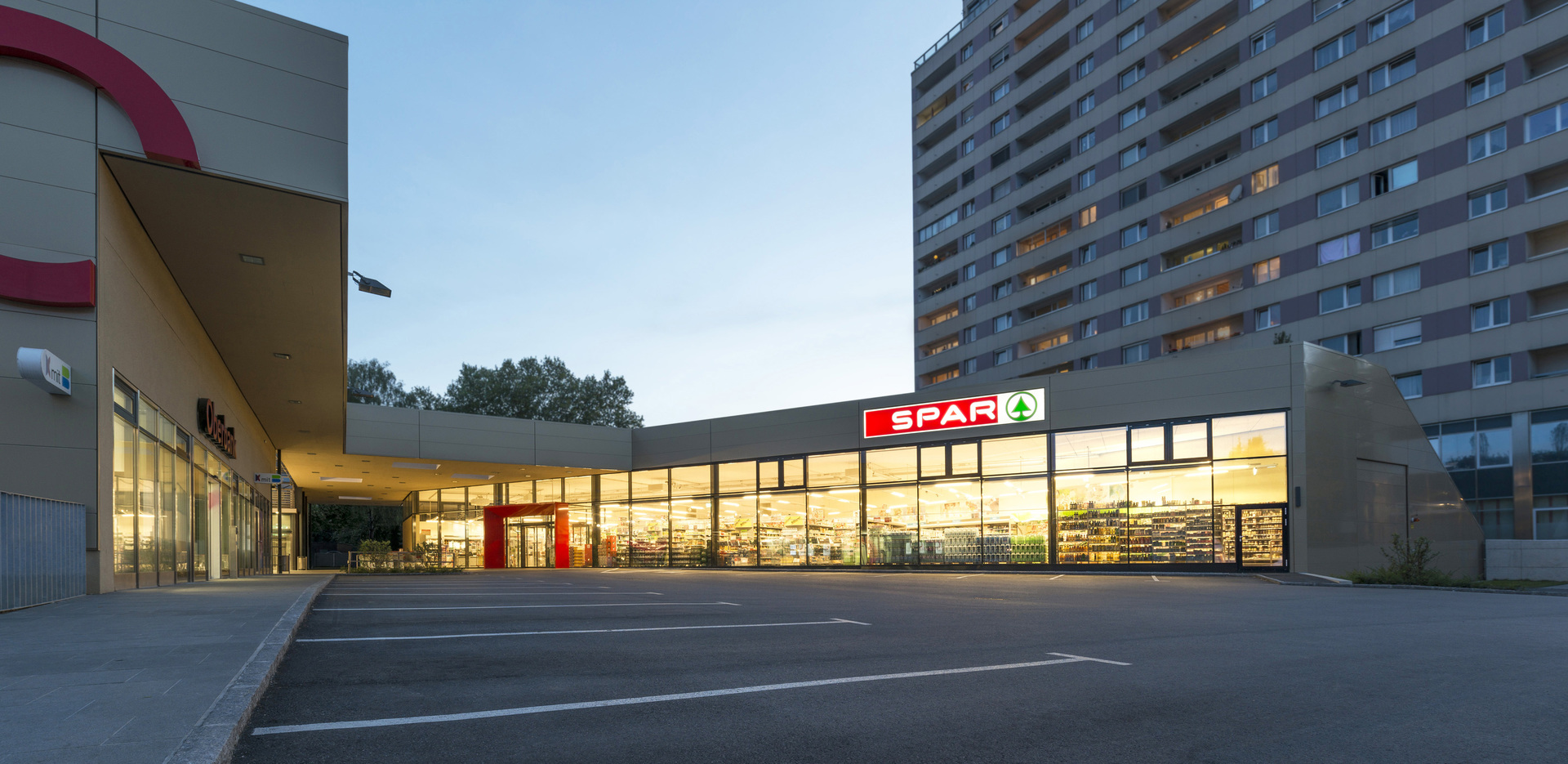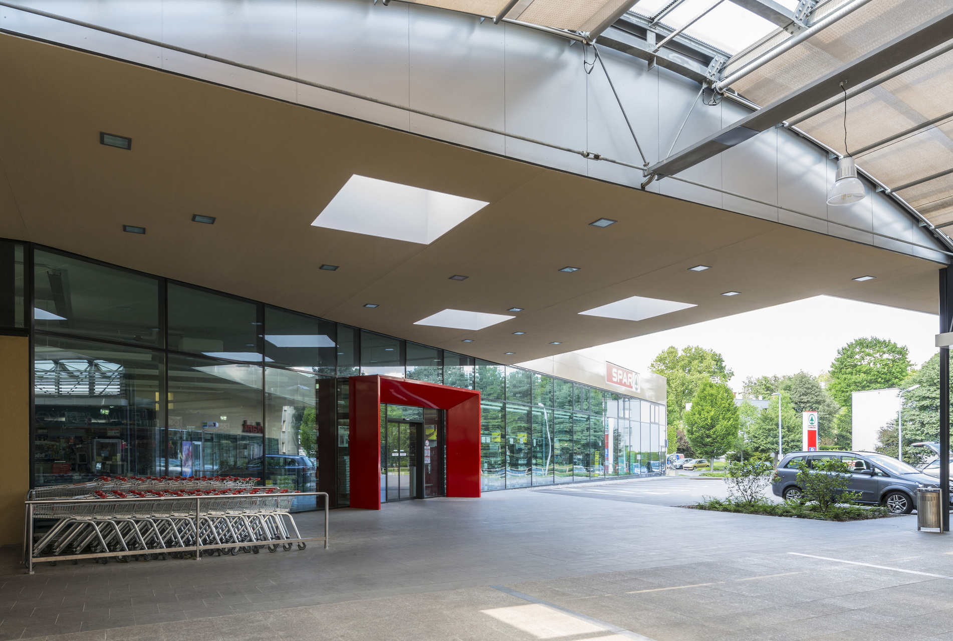 Der neue SPAR- Markt ergänzt die bestehende Struktur so wie die bestehenden Einbauten als 1- geschoßiger trapezförmiger Baukörper und schließt das Zentrum nach Nordwesten ab. Der bestehenden Innenhof wird dabei erweitert und nach Norden hin entsteht ein neuer Hauptzugang. Die schräg verlaufende Eingangsfront öffnet sich sowohl zum überdachten Innenhof, alsauch nach außen zum Parkplatz und zur Einsteinstraße. Der neue Parkplatz vor dem eingeschossigen Lebensmittelmarkt reicht von der Straße bis zum neuen Vorplatz vor dem Hauptzugang. Der dabei entstehende Höhenunterschied zum Vorplatz wird mit einer einläufigen Treppe überwunden.